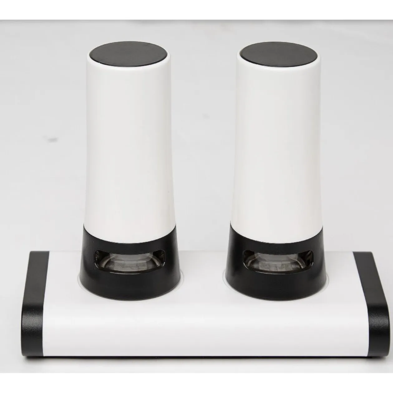 Salière et poivrière avec support aimanté noir et blanc, pratique pour les garder bien rangés après utilisation.