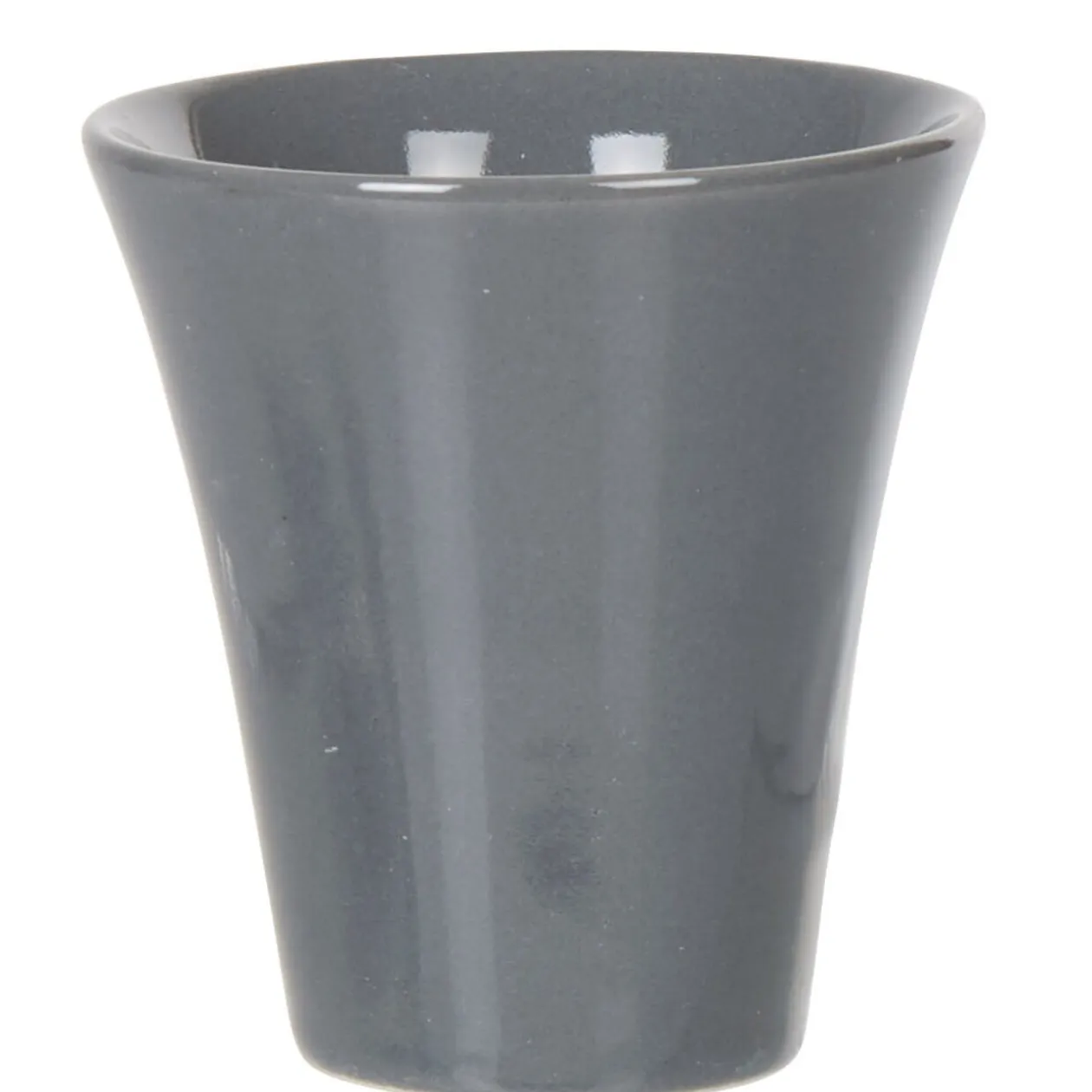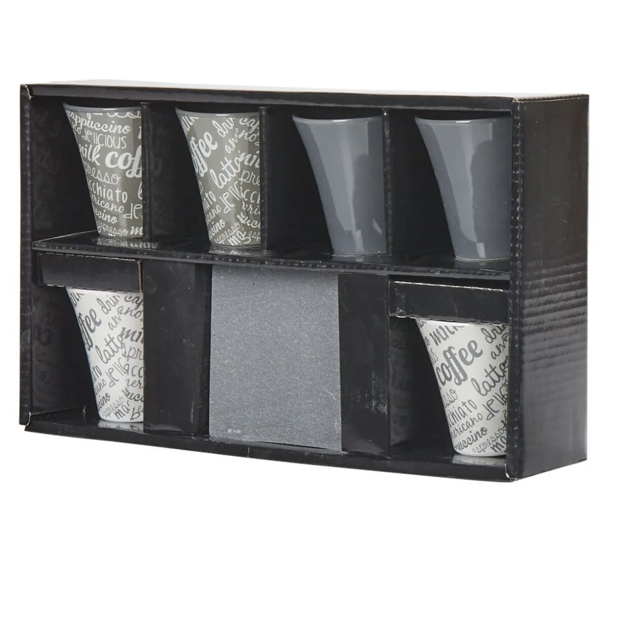 Service à café composé de 6 sous-tasses en ardoise et 6 tasses en faïence multicolore gris blanc.