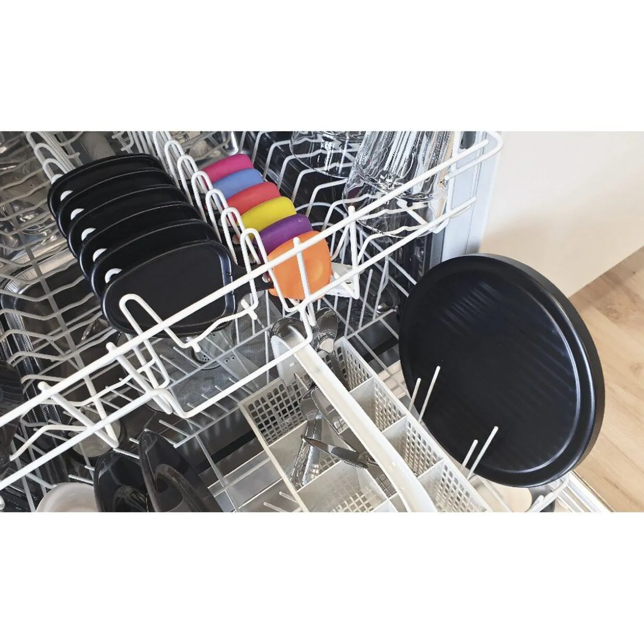 Service à raclette faisant aussi office de grill sur le dessus, de couleur noire équipée de 6 caquelons antiadhésif avec manches multicolores.