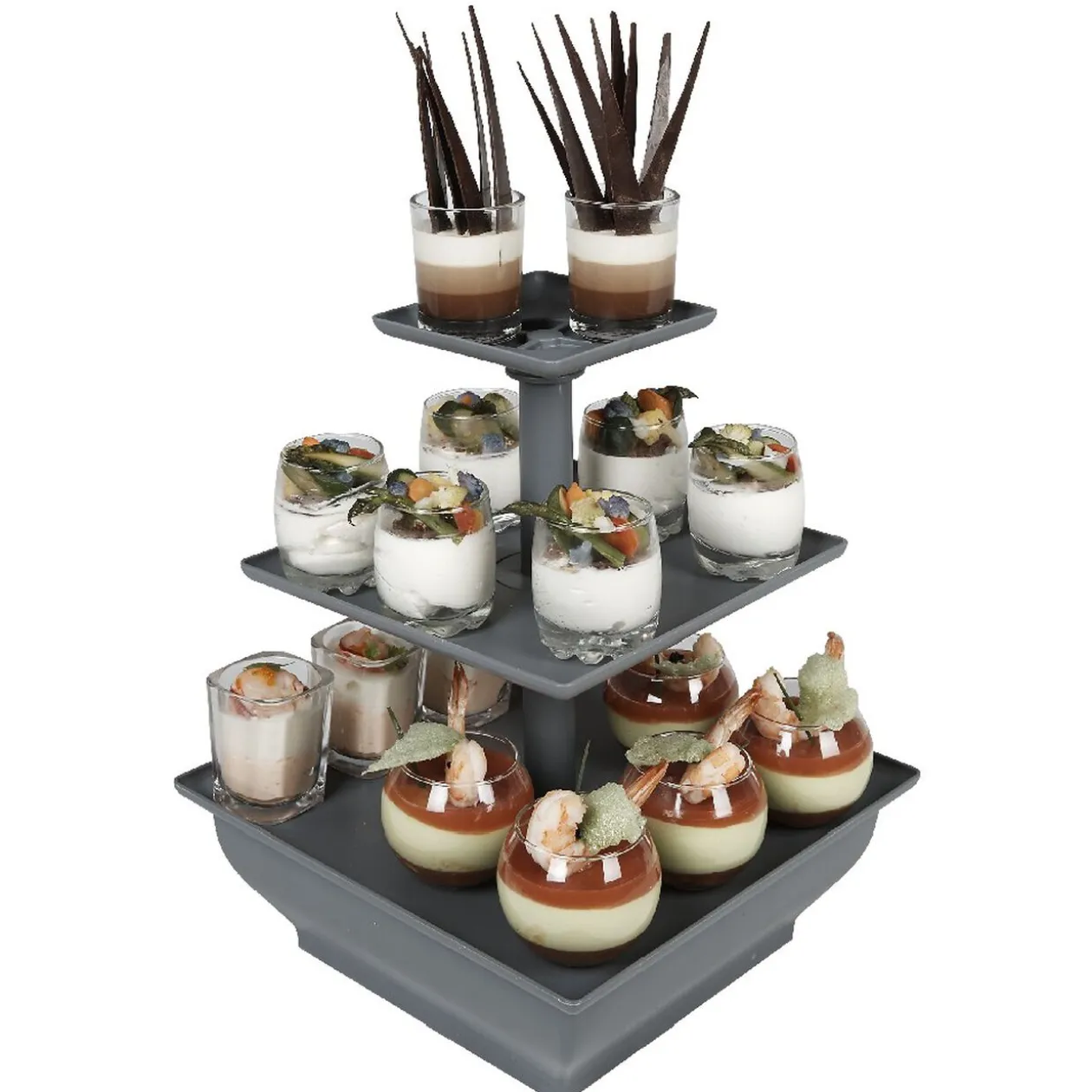 Serviteur gris anthracite à 3 niveaux, idéal pour présenter l’apéritif ou le dessert.