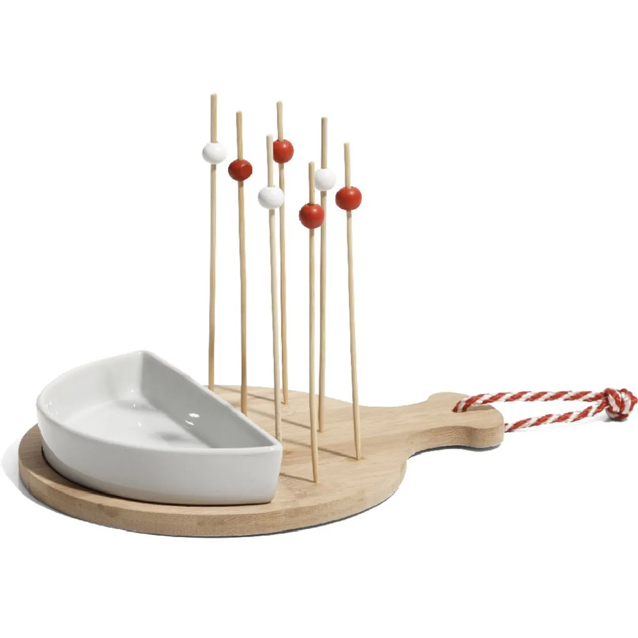 Set apéritif avec 1 planche en bois, 1 coupelle demi-lune blanche en porcelaine et 8 pics à brochette en bois, dim. 23,5x18x1,5 cm.