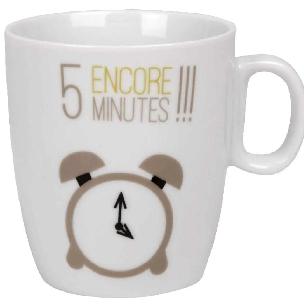 Tasse à café blanche motif réveil avec inscription « encore 5 minutes ».