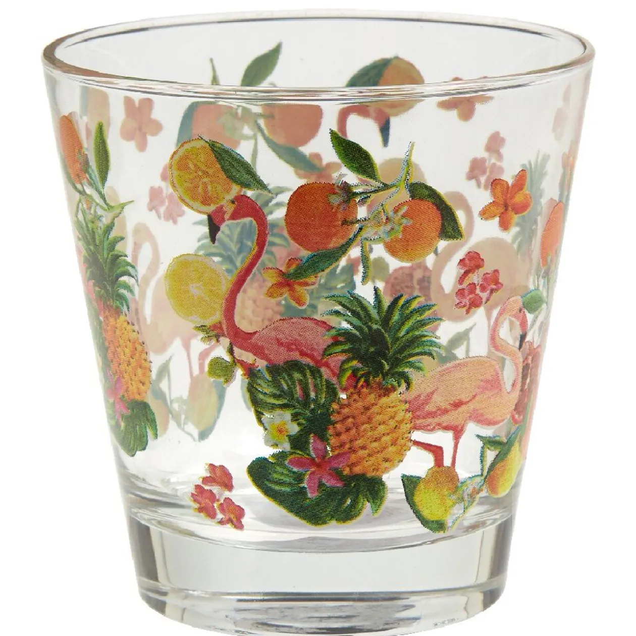 Verre bas d’une contenance de 25cl, style tropical avec motifs fruits et flamants roses.
