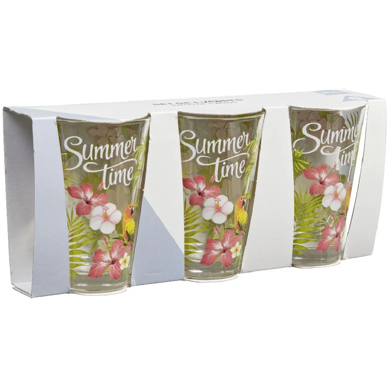 Lot de 3 verres haut Nadia Jungle au motif fleuri laissant apparaître un toucan, un perroquet et l’inscription « Summer Time ».