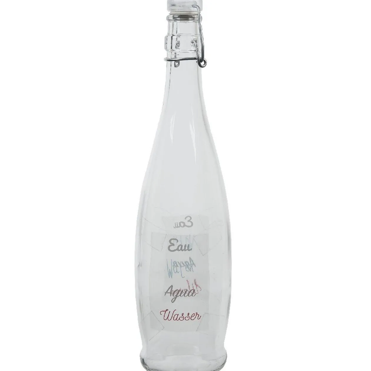 Bouteille à boisson d’une contenance de 1 litre transparente et avec inscription du mot EAU en différentes langues.