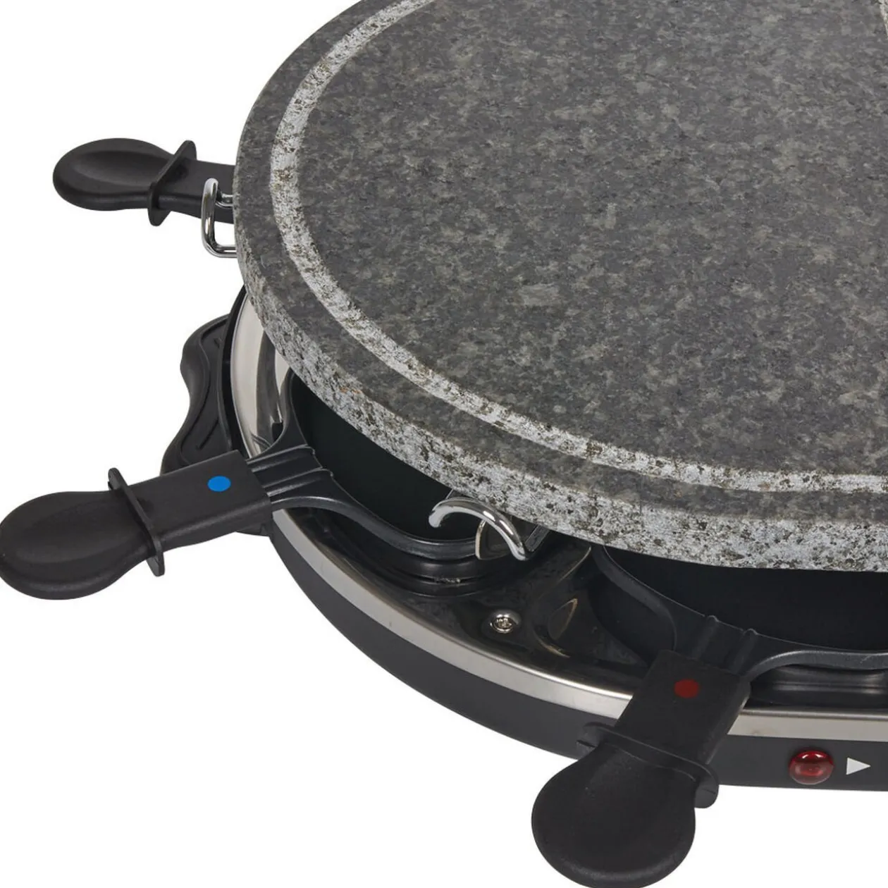 La princesse des machines à raclette arrive pour l’hiver. Invitez vos amis à partager un moment convivial sans vous casser la tête à faire à manger. Sortez cet appareil à raclette pour 8 personnes et régalez-vous ! Avec son côté grill et son côté pierre, agrémentez charcuterie et fromage avec des oignons et des lardons et des aubergines grillées et des piments et des oeufs au plat sur le côté pierre. Avec sa puissance de 1200 w, elle se nettoie facilement grâce à ses 8 poêlons au revêtement antiadhésif et compatible au lave-vaisselle ainsi que ses 2 plaques amovibles antiadhésives.