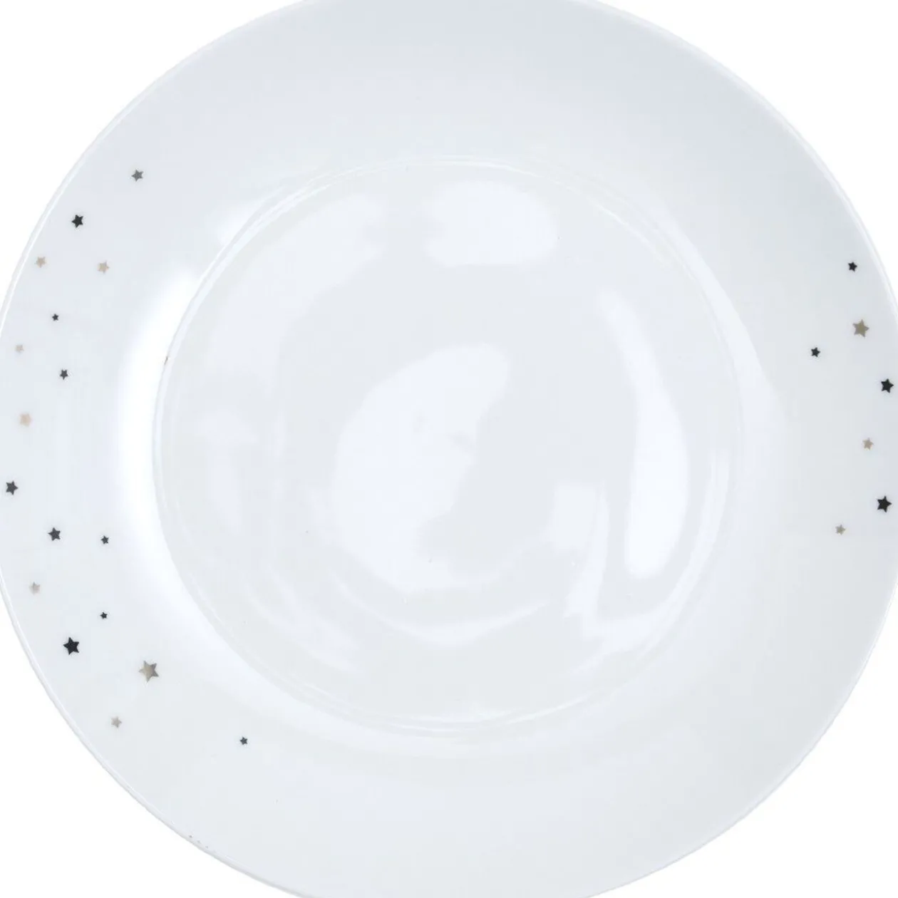 Assiette à dessert blanche au contour décoré de motifs étoiles bleu et or.