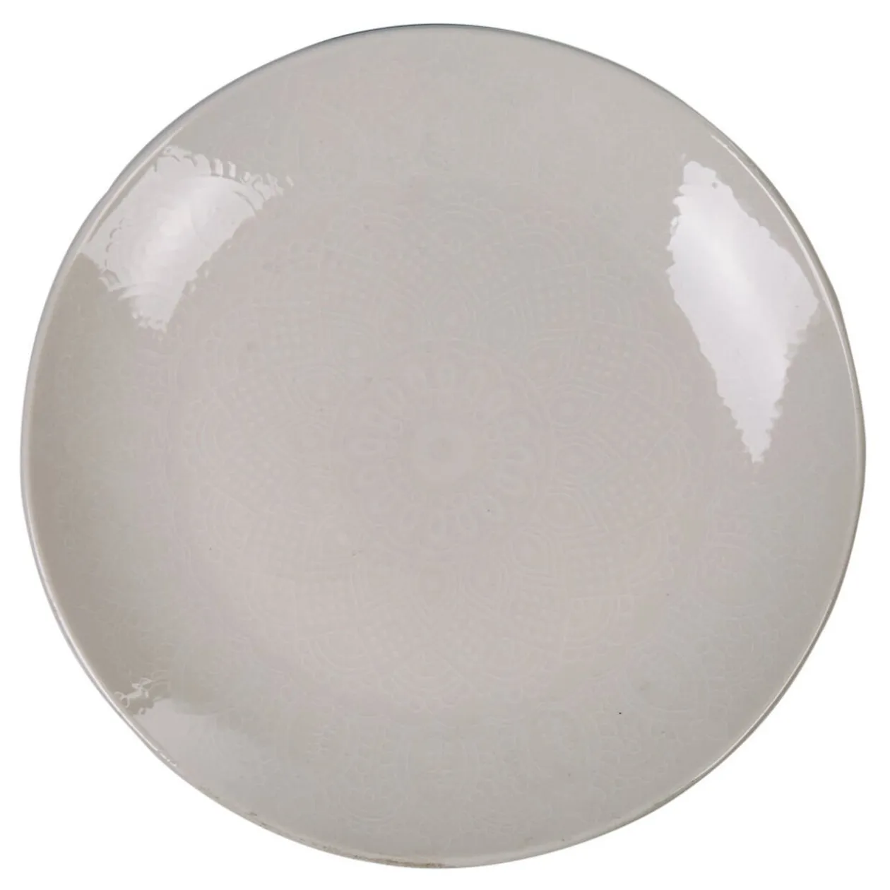 Assiette à dessert ronde plate en faïence de couleur blanche avec motif rosace à l’intérieur.
