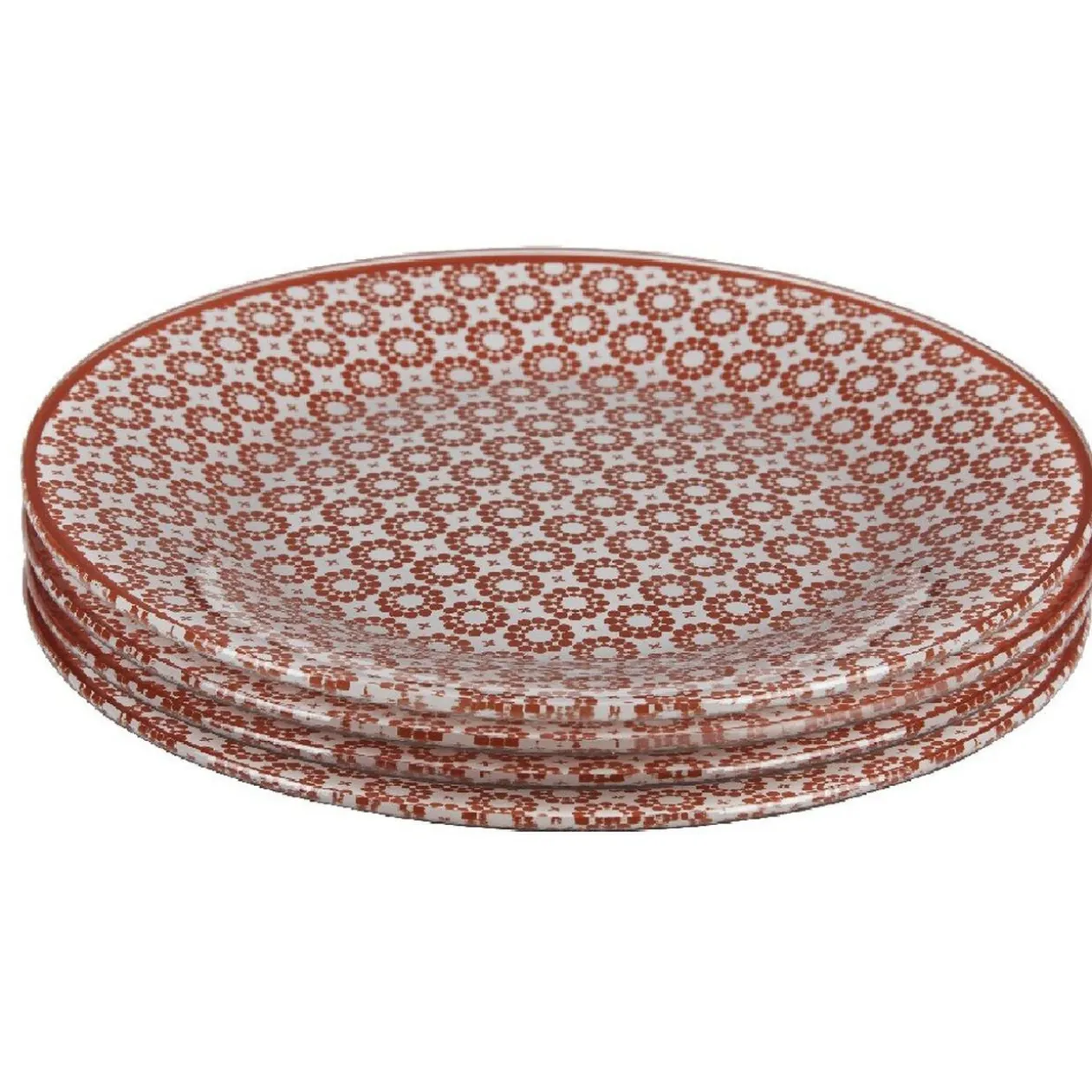 4 assiettes à dessert Micro de couleur blanc, motifs pois en forme de fleurs rouges.