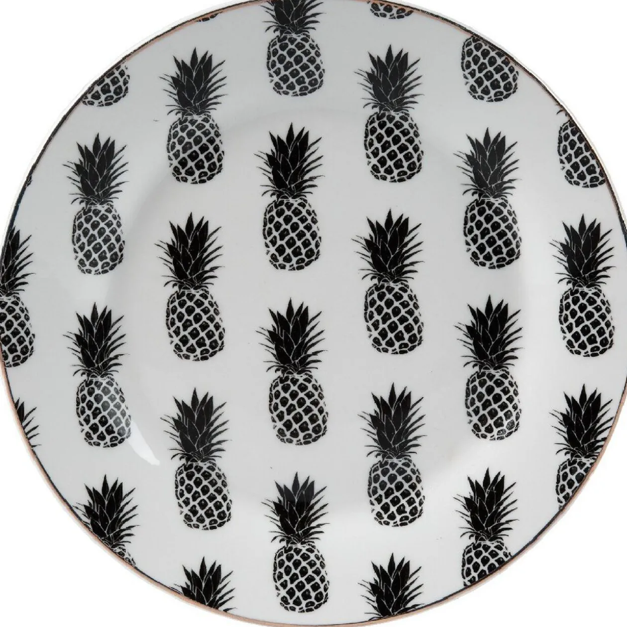 Jolie assiette à dessert ronde blanche en porcelaine style tropical avec petits motifs ananas noirs dans le fond.