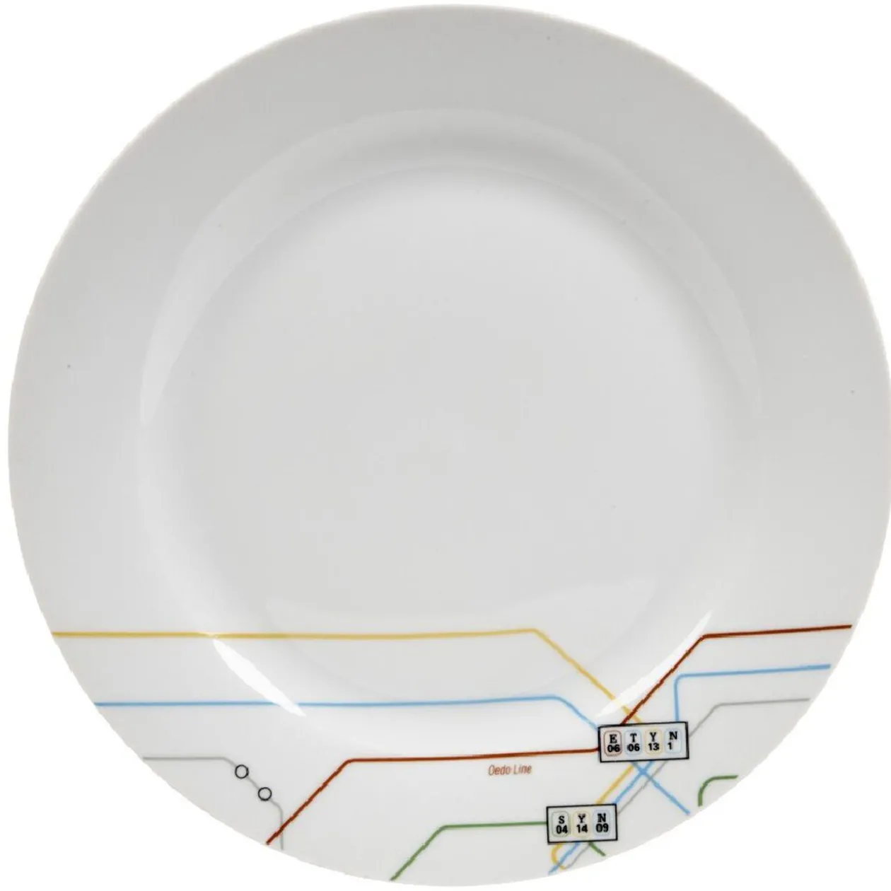 Assiette plate blanche décor lignes multicolores, Ø 26,5 cm, porcelaine.