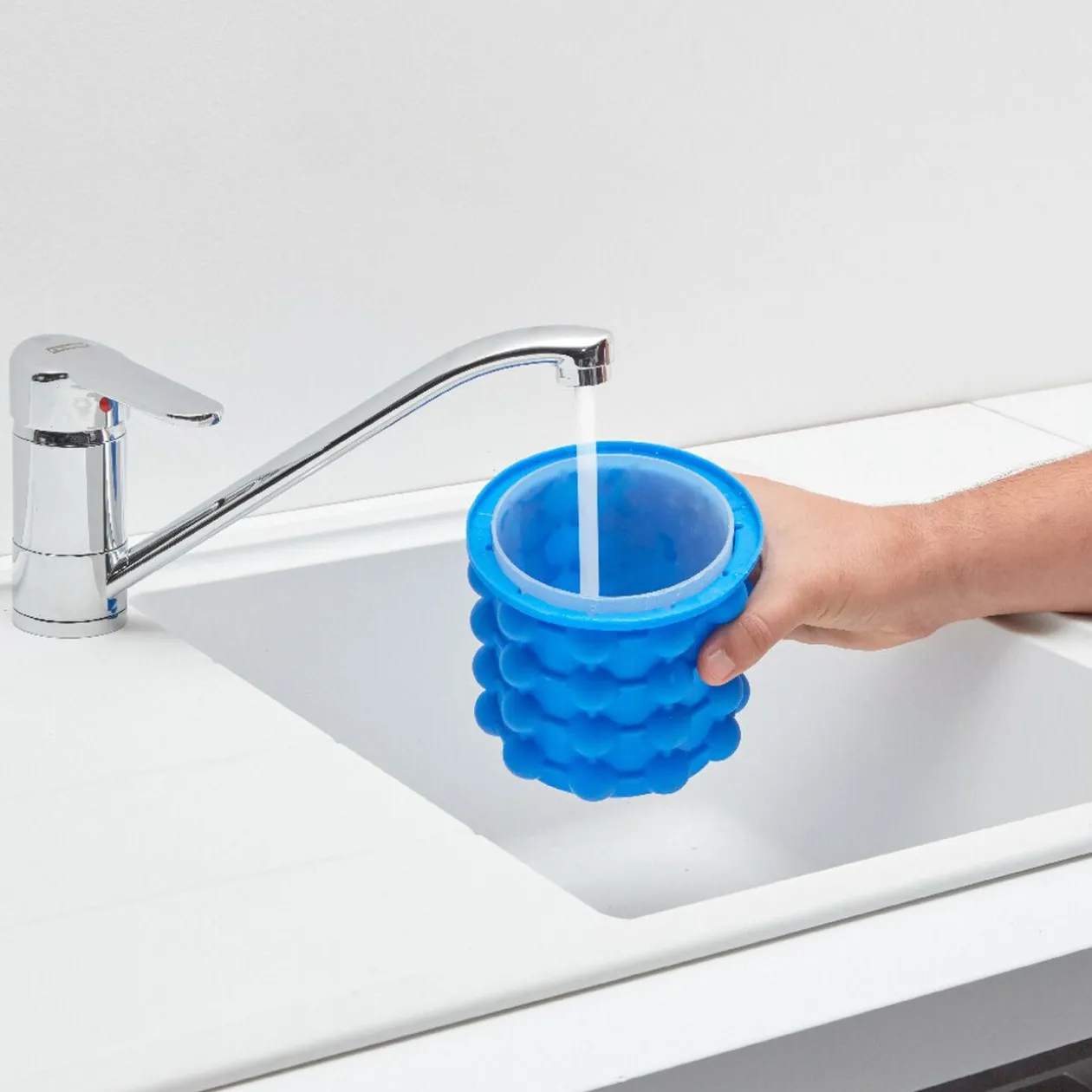 Bac à glaçons bleu en silicone. Emplacement pour mettre une canette ou une bouteille au milieu et faire les glaçons tout autour, refermable avec un couvercle.