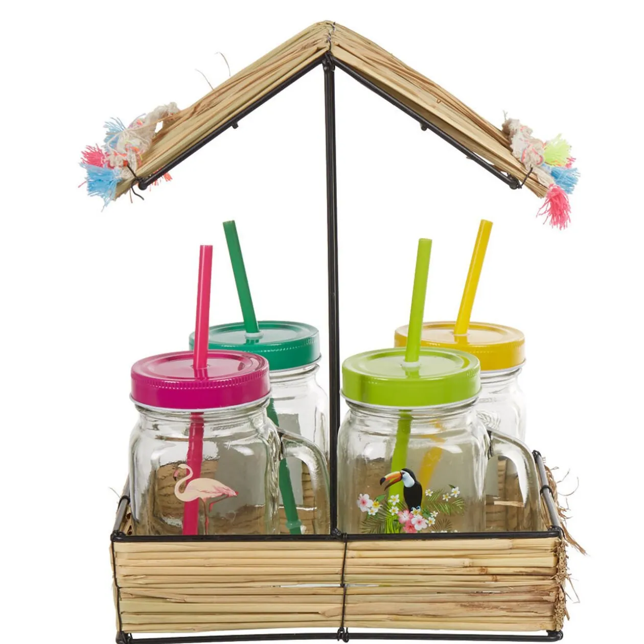 Recevez vos invités dans une ambiance tropicale avec ce support en paille et ses 4 gobelets en verre !