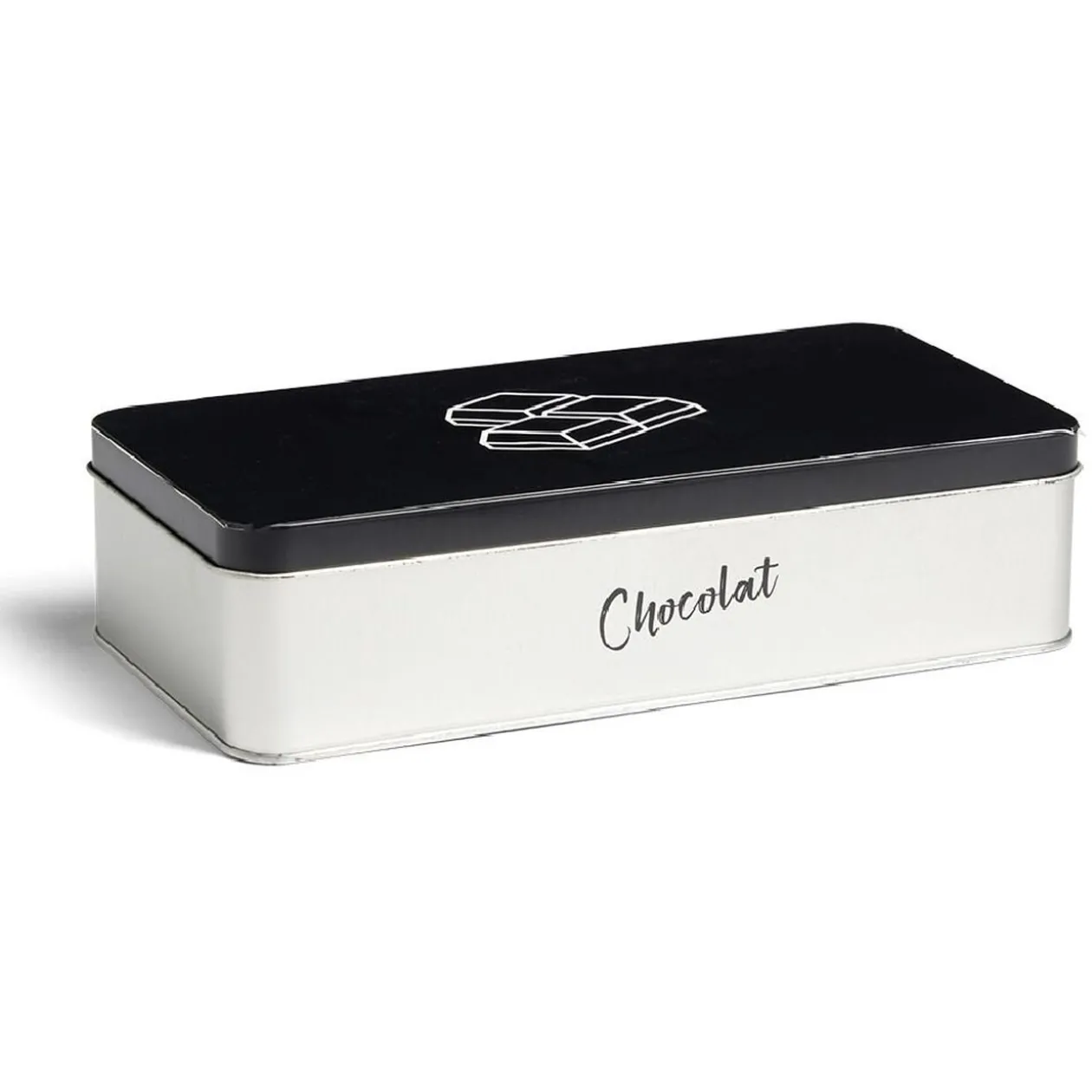 Boîte rectangulaire en métal imprimé carrés de chocolat. Design et pratique pour conserver la fraîcheur et l’arôme de vos chocolats.