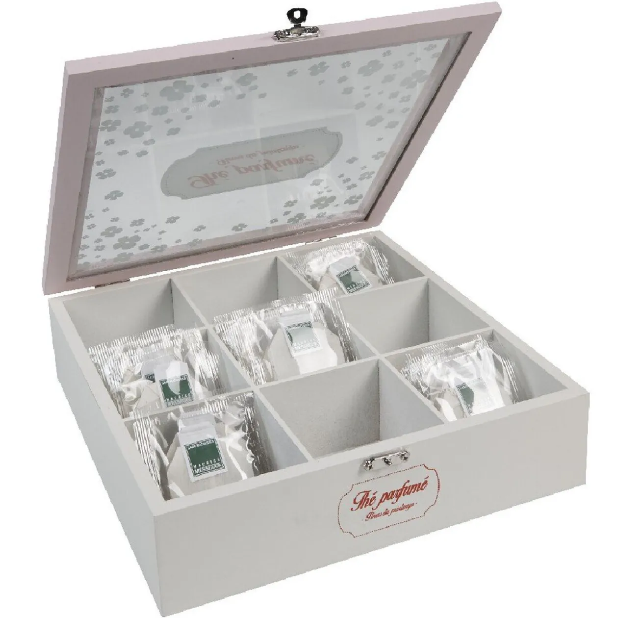 Boîte à thé rose et blanche, motif fleur de cerisier, 9 compartiments.