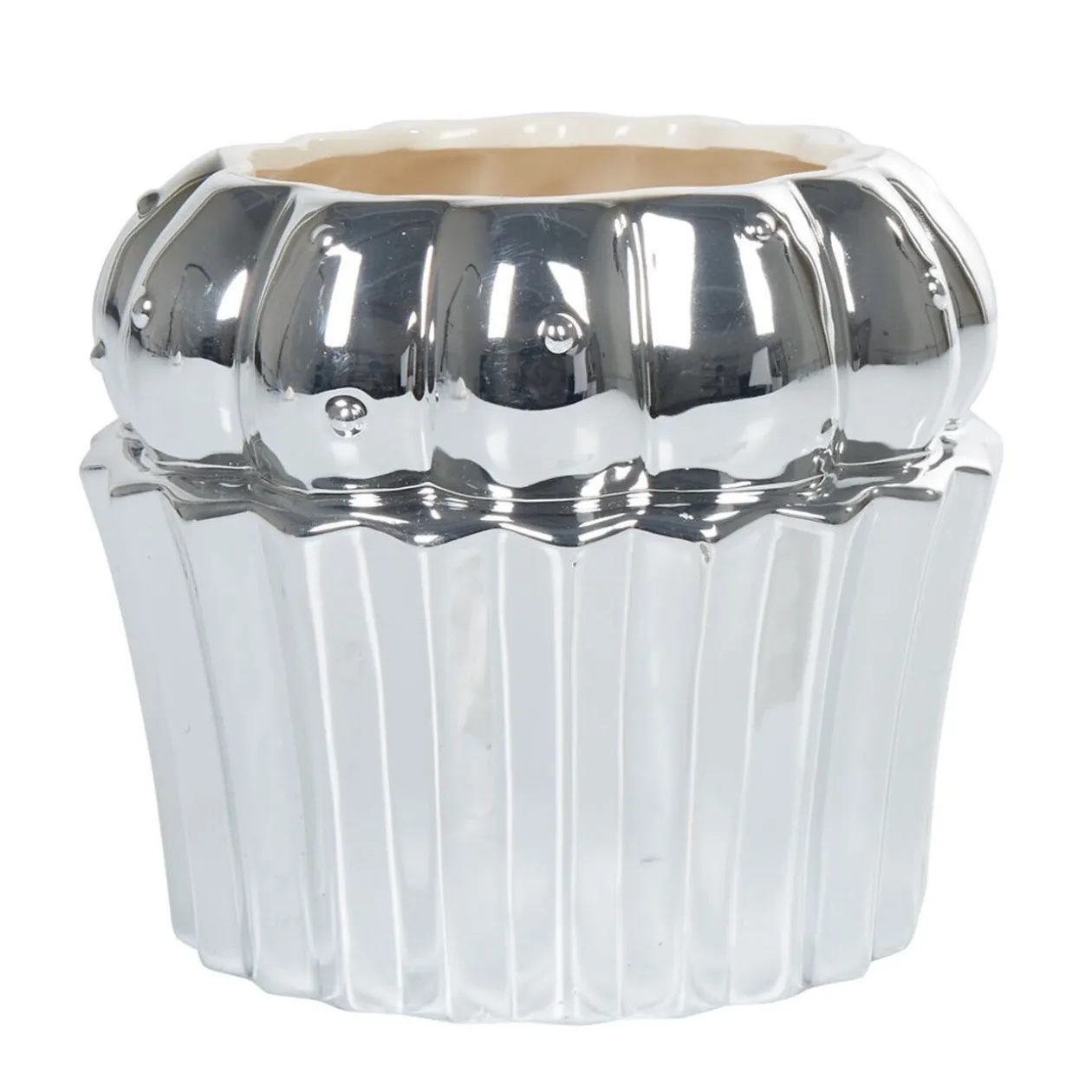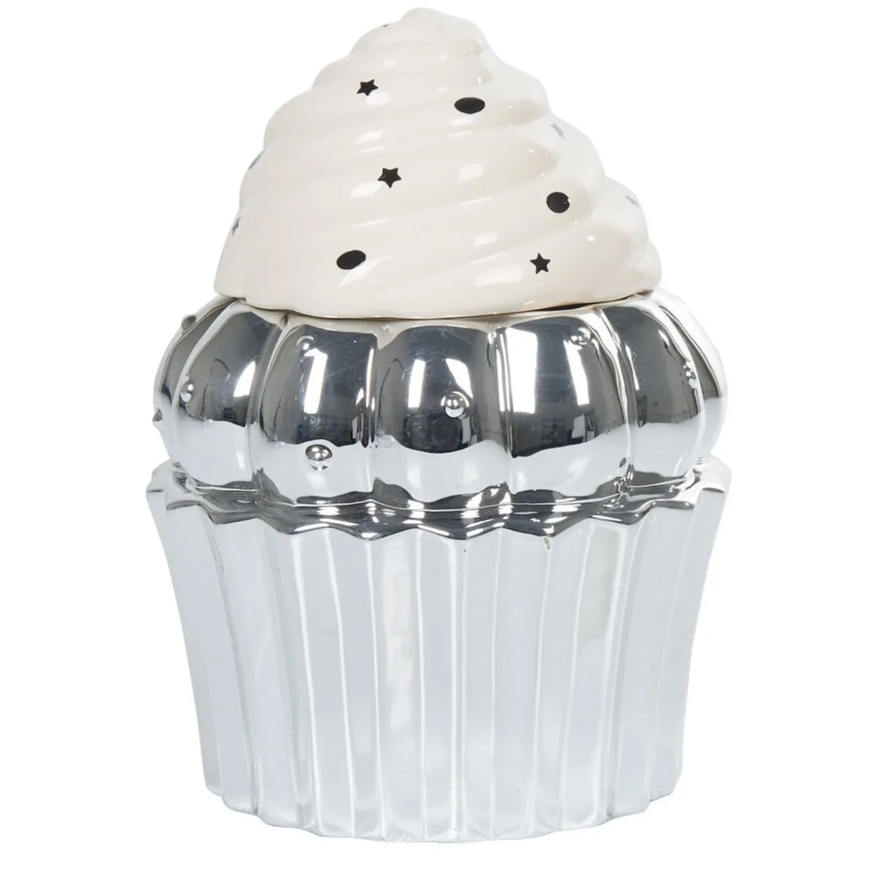 Jolie bonbonnière en faïence gris argenté avec couvercle blanc design cupcake, idéal pour vos moments plaisirs.