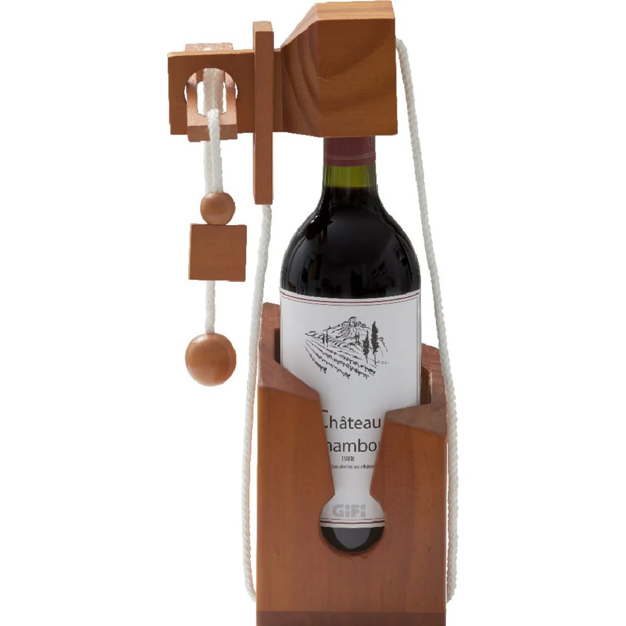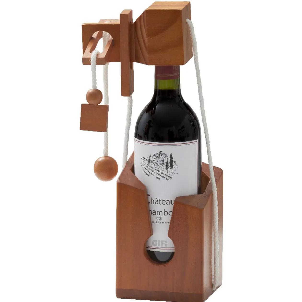 Casse-tête bouteille emprisonnée avec cadenas et support en pin naturel. Vous pouvez tout aussi bien y mettre une bouteille authentique millésimé ou tout simplement l’offrir en guise de cadeau, mais pensez à garder la clé pour plus de rigolades !