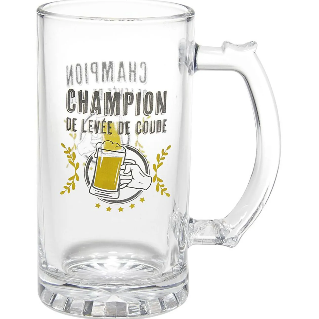 Chope à bière en verre transparent avec inscription noire.