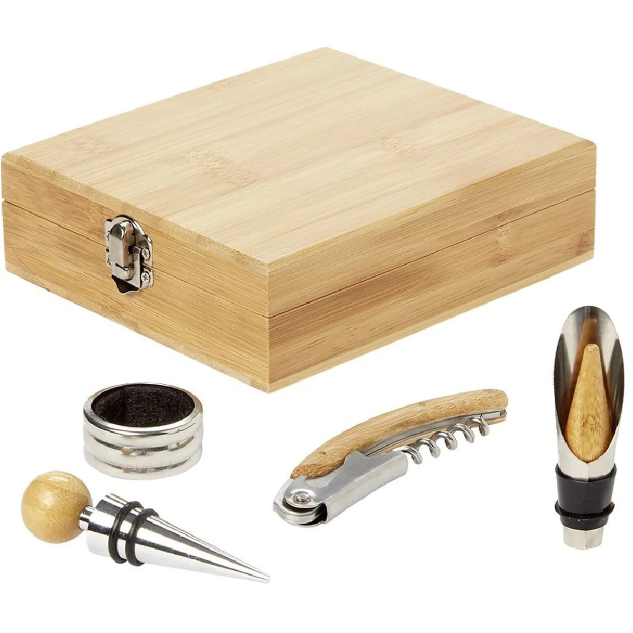 Coffret sommelier en bambou composé de 4 accessoires en inox pour déguster et servir le vin :