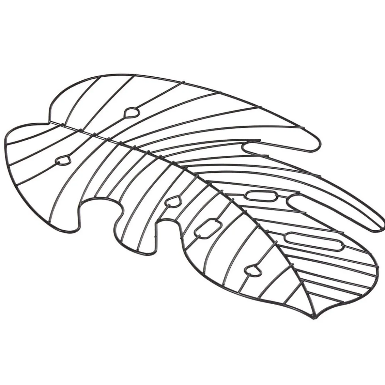 Dessous de plat en forme de feuille, de couleur noire, avec structure en métal et verre.