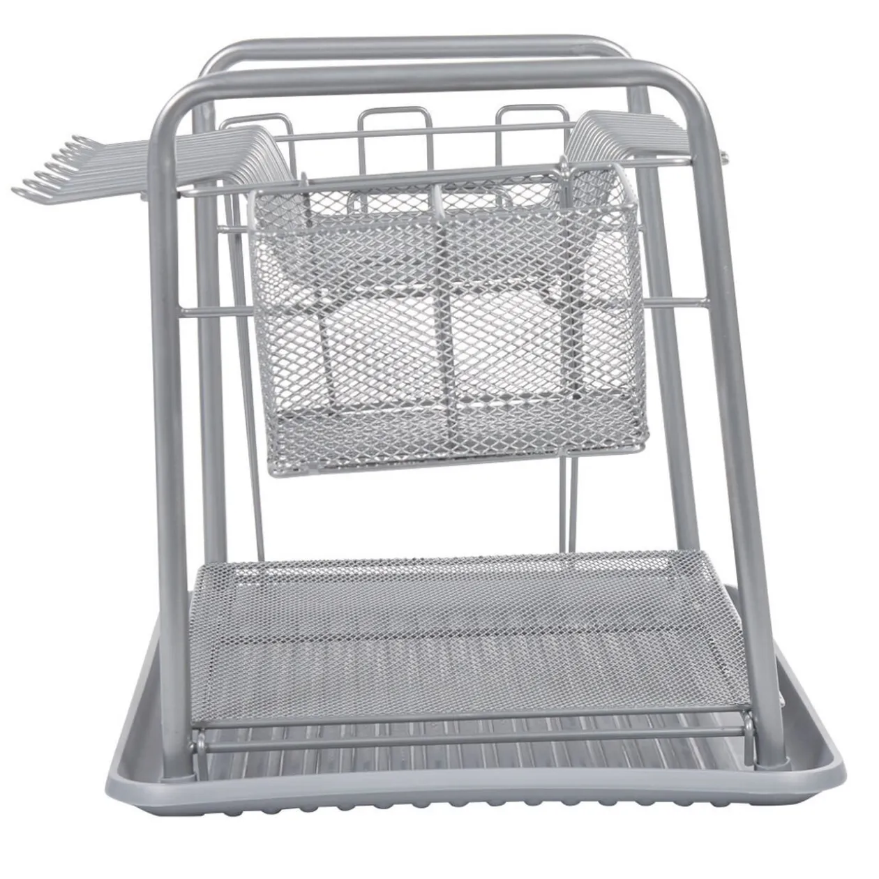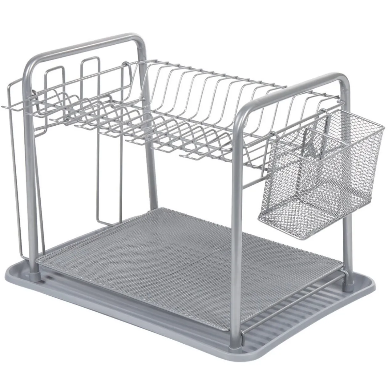 Egouttoir à vaisselle avec range-couverts en métal gris.