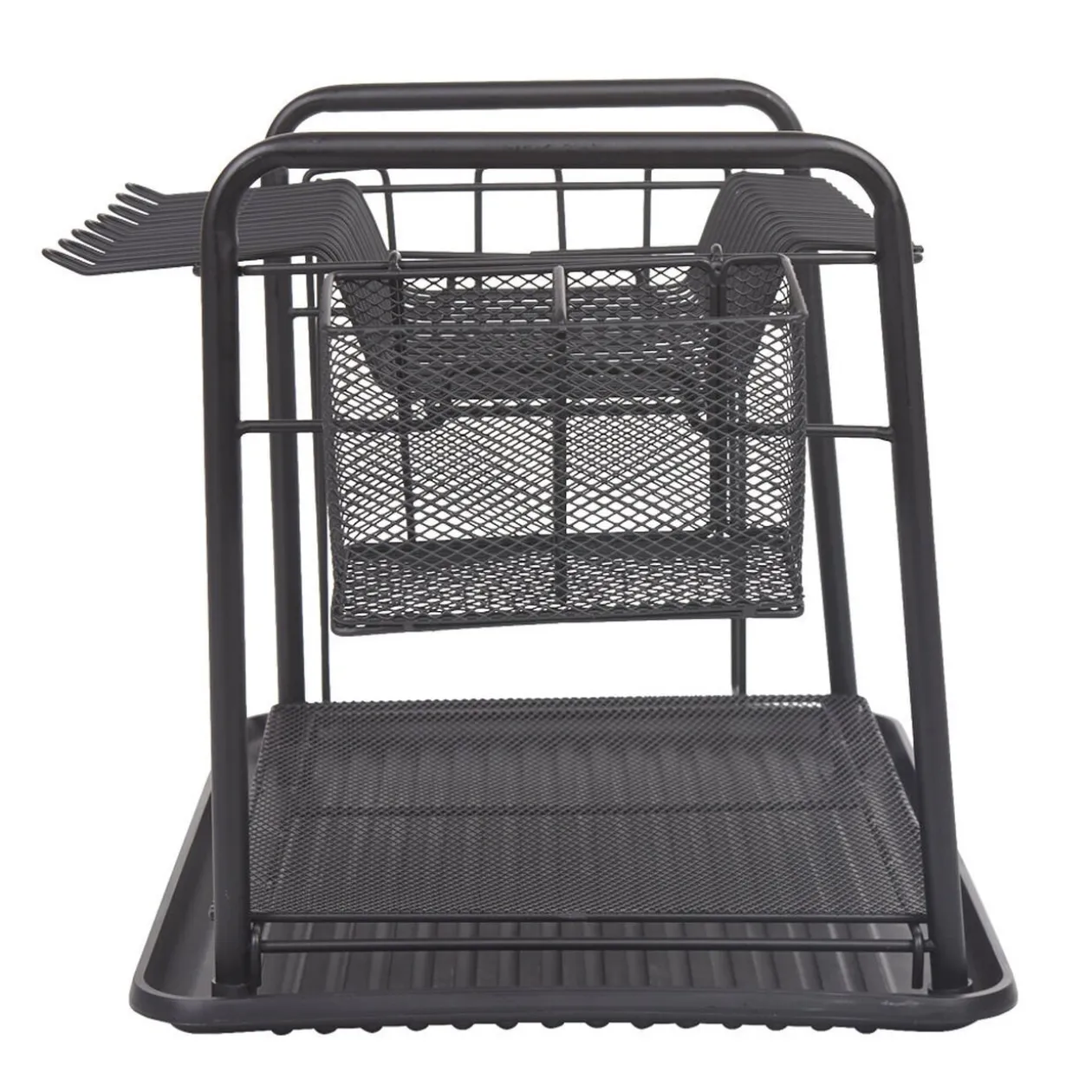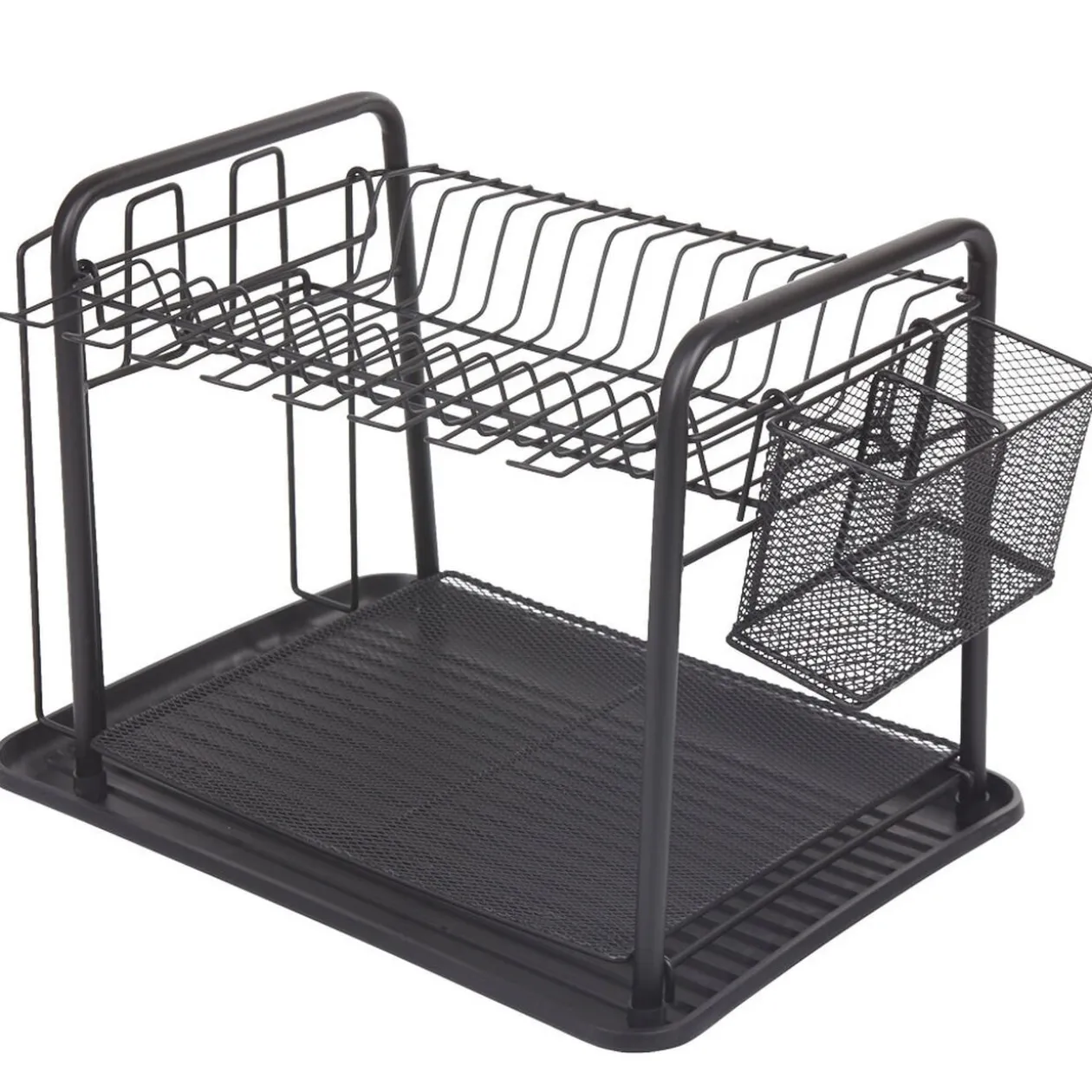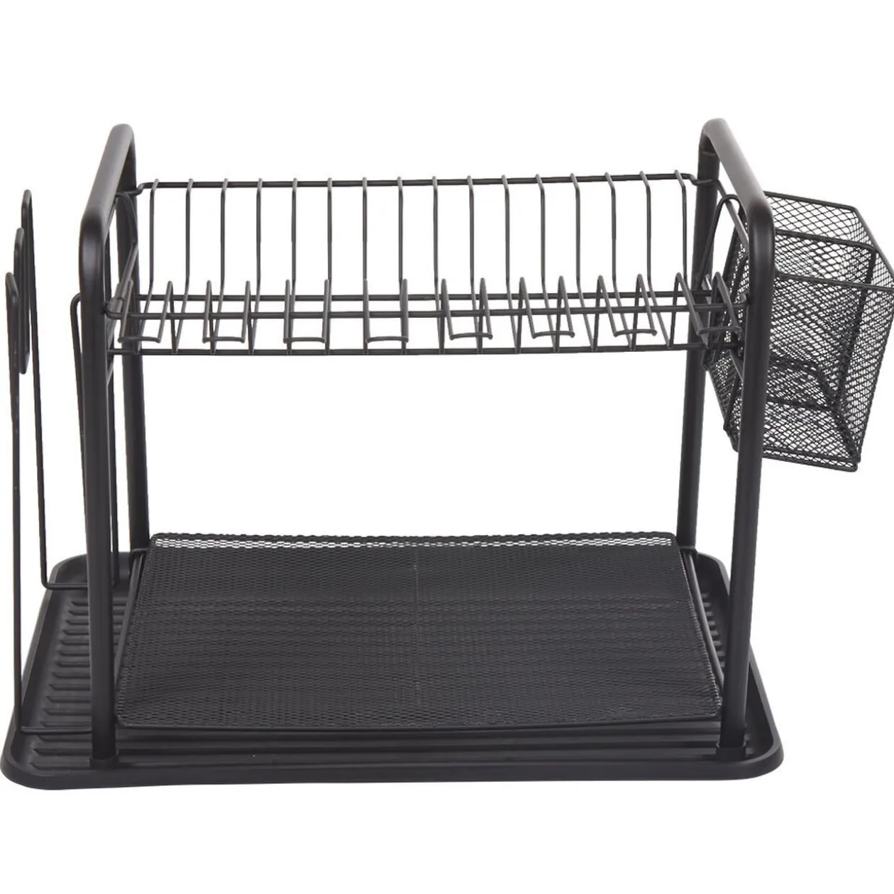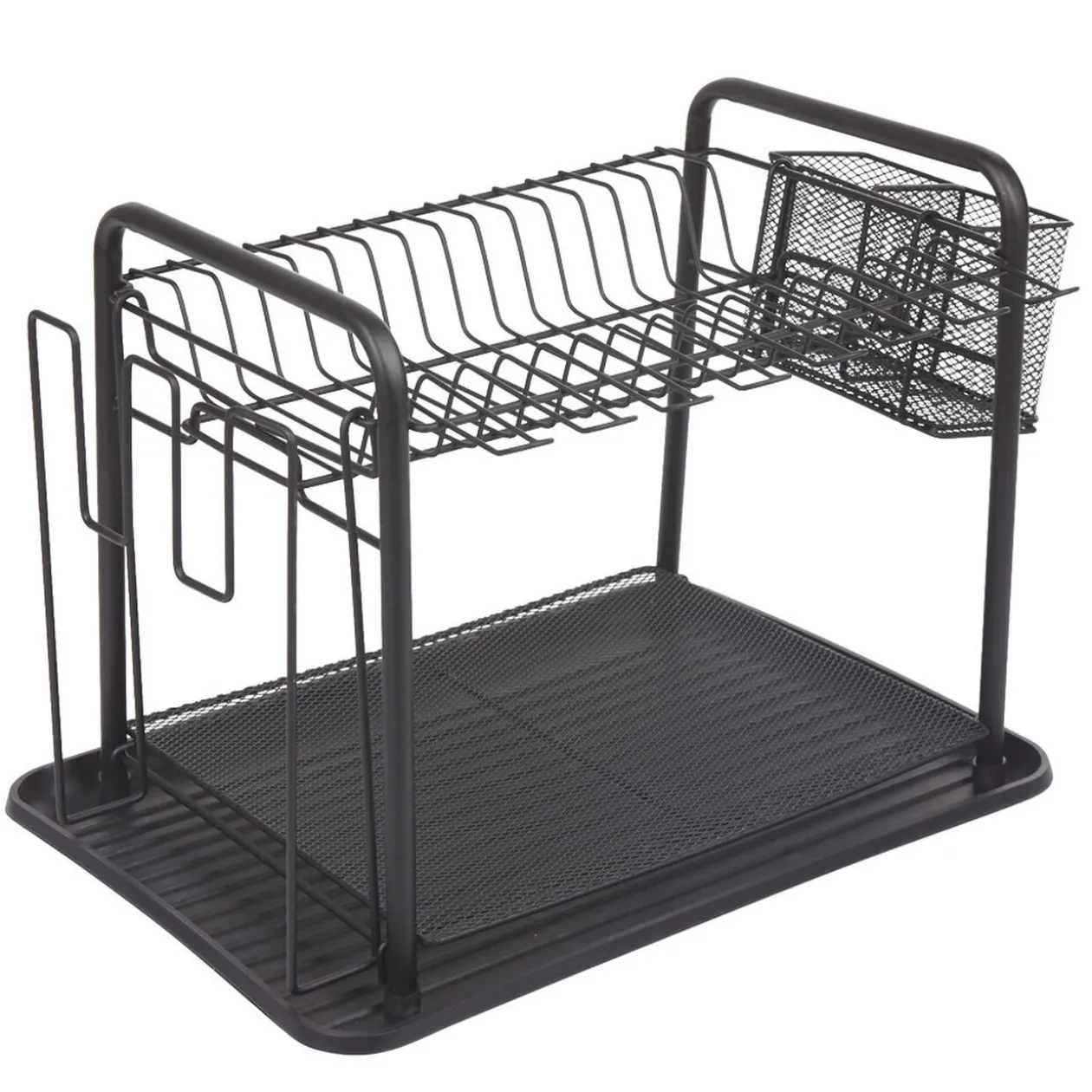 Egouttoir à vaisselle avec range-couverts en métal noir.