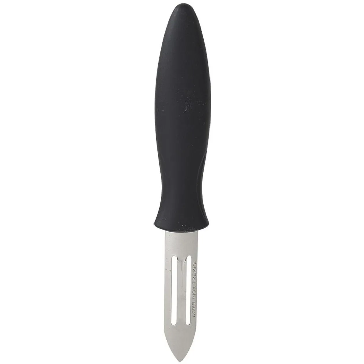 Éplucheur en inox avec manche ergonomique en polypropylène noir.