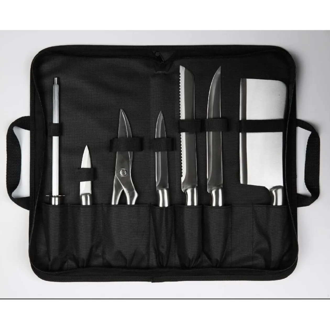 Etui et 7 ustensiles de découpe en inox : fusil à aiguiser, sécateur, couperet à viande, couteau à pain, couteau du chef, couteau à désosser et couteau d’office.