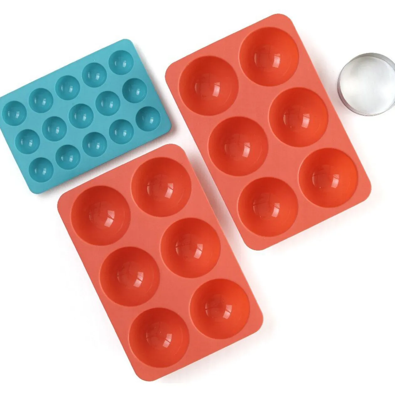 Gifibox dômes et coques comprenant 2 moules en silicone de 6 dômes ø 6,5 cm, 1 moule en silicone de 15 inserts ø 2,5 cm, 1 emporte-pièce en inox ø 6 cm et 1 livre de recettes.