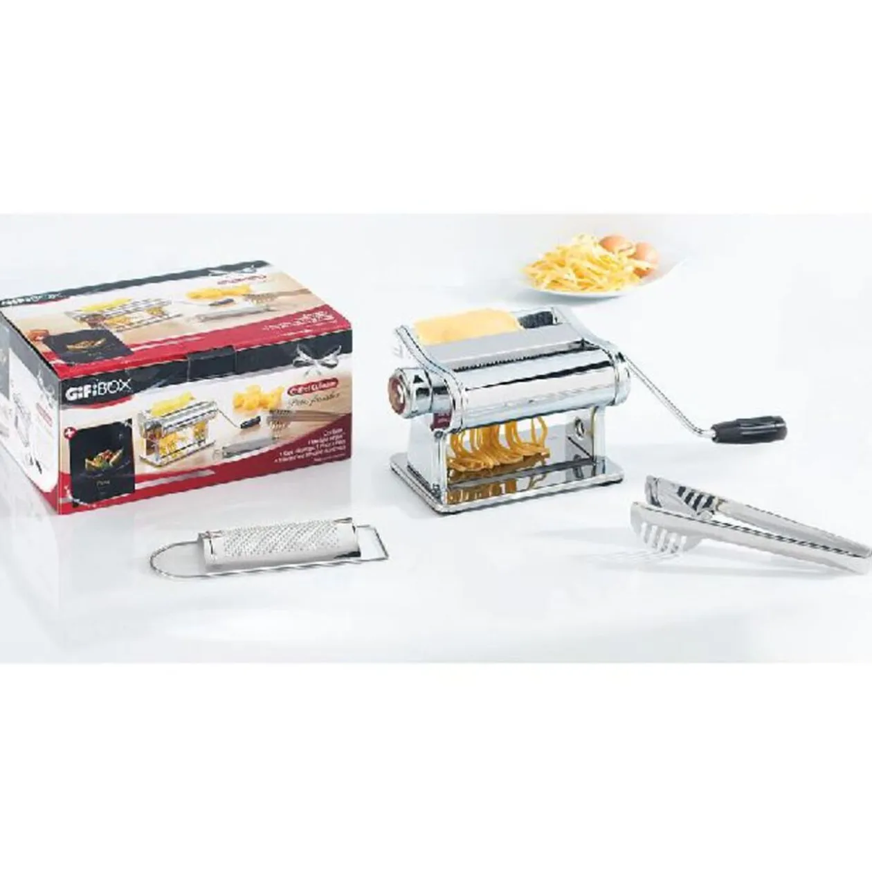 Retrouvez à l’intérieur de ce coffret un livre (éditions Hachette) regroupant une multitude de recettes gourmandes à base de pâtes, à partager toute l’année. La machine à pâtes et ses accessoires (1 râpe à fromage et 1 pince à pâtes) vous garantissent des soirées « Pasta! » réussies. Régalez vous avec ce coffret ludique et gourmand !Les GiFi Box sont des coffrets cadeaux sur des thématiques variées: culinaire mais aussi l’art de recevoir, le bien-être, les loisirs… Découvrez vite toute la gamme des .