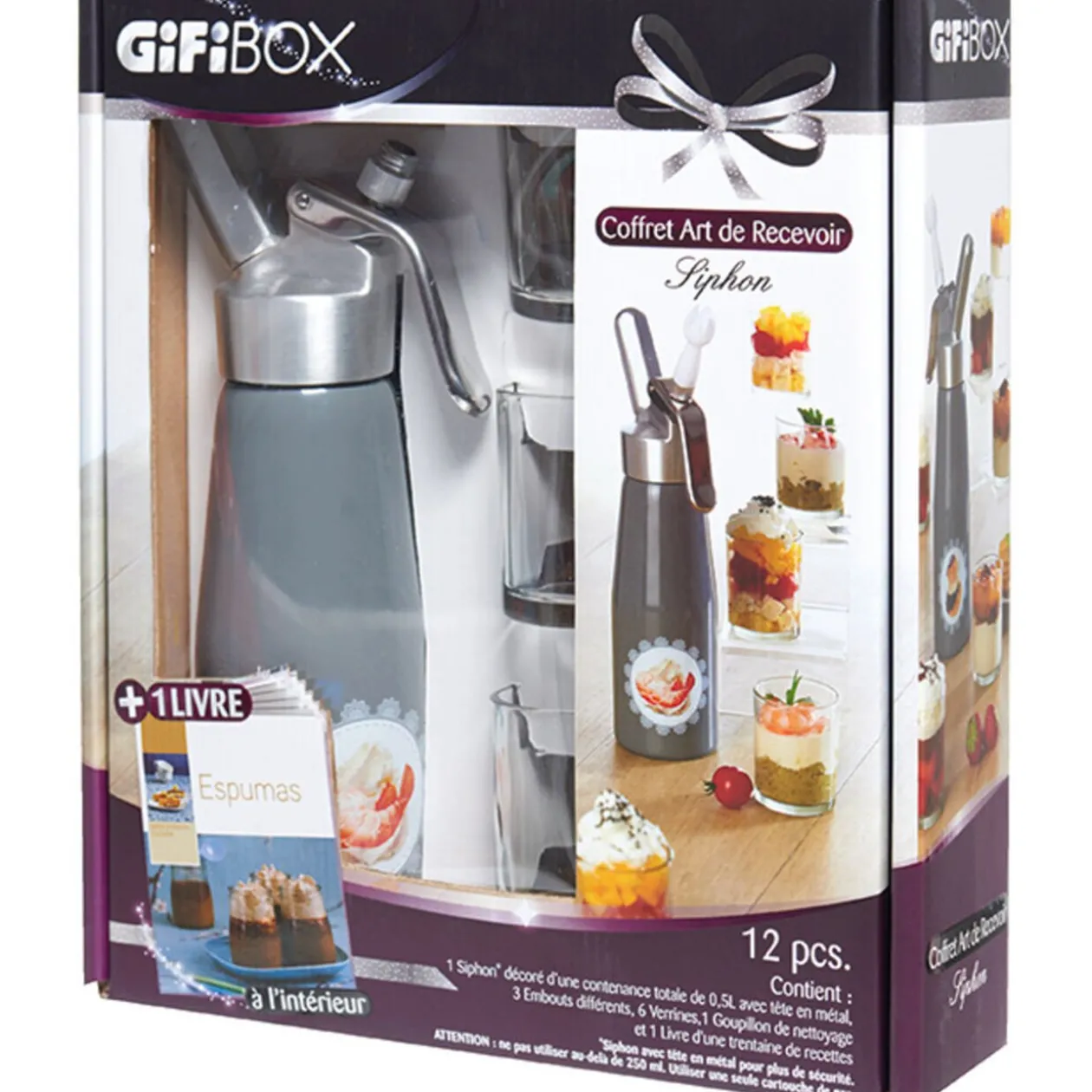 Coffret Gifibox siphon comprenant 1 siphon décoré 0,5 L, 3 embouts différents, 6 verrines, 1 goupillon de nettoyage et 1 livret de recettes.