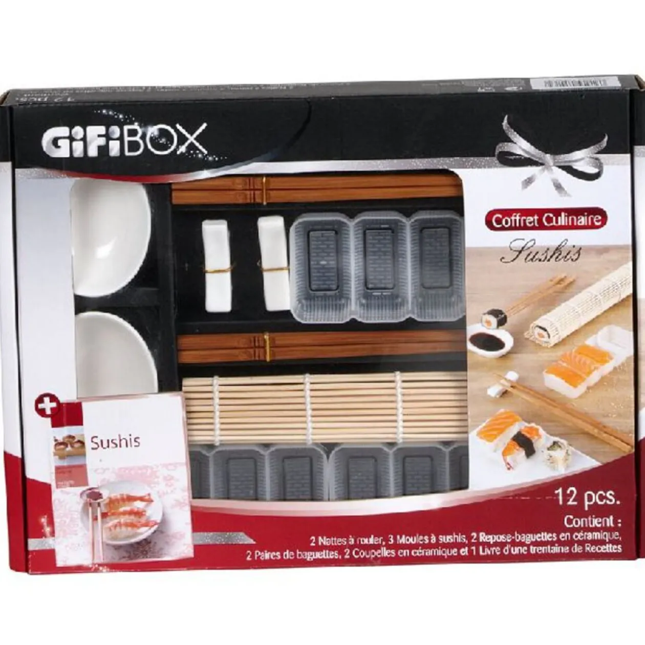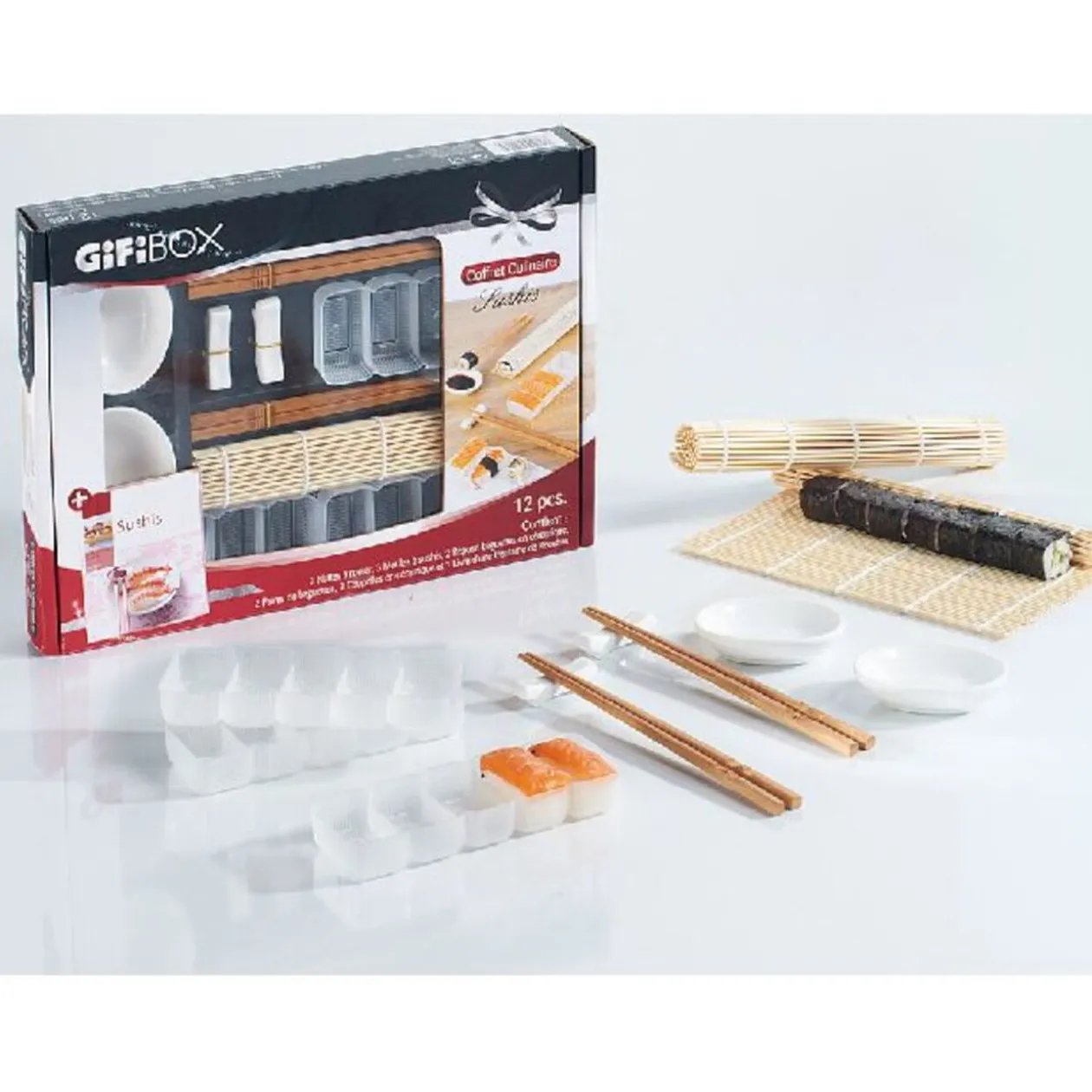 Retrouvez dans ce coffret cadeau tout le matériel nécessaire pour réaliser et déguster des sushis et makis dans la pure tradition. Les nattes en bambou ainsi que les godets fournis vous permettront de confectionner vos sushis rapidement et facilement. Avant de vous lancer, découvrez les techniques de réalisation dans le livre de recette joint (éditions Hachette).Le coffret cadeau Sushis contient: 2 nattes à rouler, 3 moules à sushis, 2 repose-baguettes en céramique, 2 paires de baguettes, 2 coupelles en céramique et 1 livre de recettes.Les GiFi Box sont des coffrets cadeaux sur des thématiques variées: culinaire mais aussi l’art de recevoir, le bien-être, les loisirs… Découvrez vite toute la gamme des .