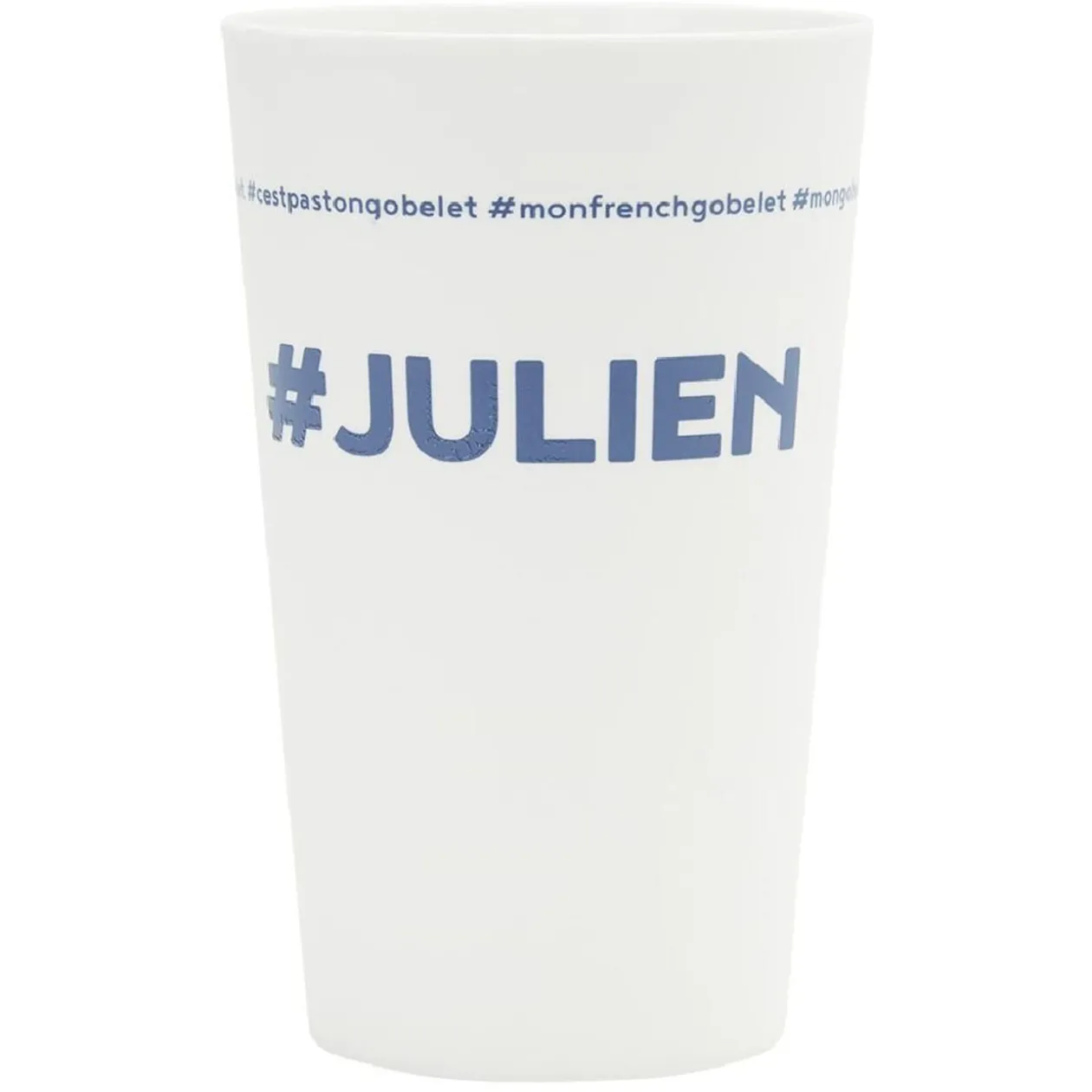 Gobelet réutilisable en plastique blanc avec inscription bleue #JULIEN.