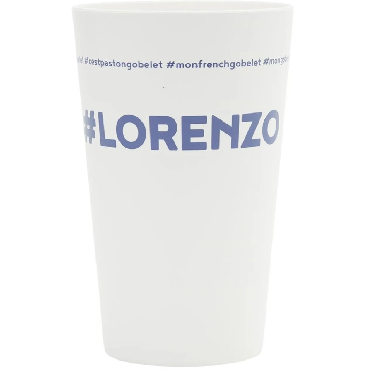Gobelet réutilisable en plastique blanc avec inscription bleue #LORENZO.