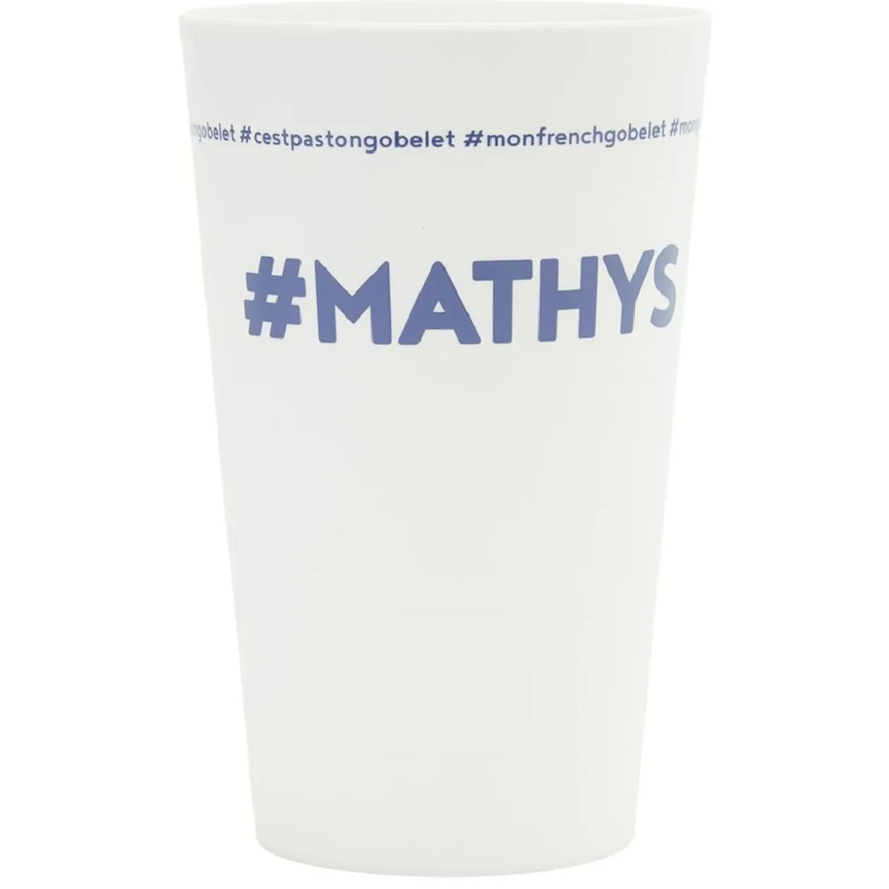 Gobelet réutilisable en plastique blanc avec inscription bleue #MATHYS.