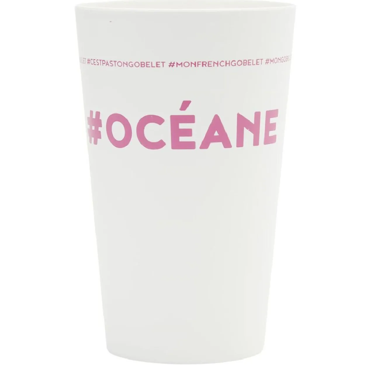 Gobelet réutilisable en plastique blanc avec inscription rose #OCÉANE.