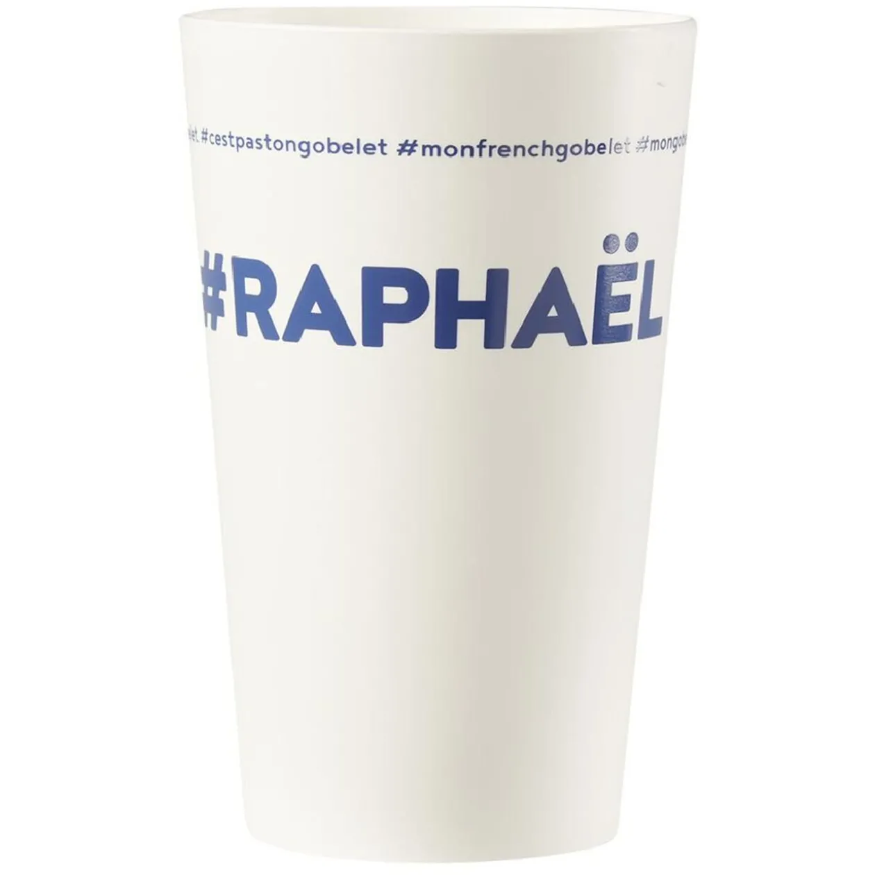 Gobelet réutilisable en plastique blanc avec inscription bleue #RAPHAEL.