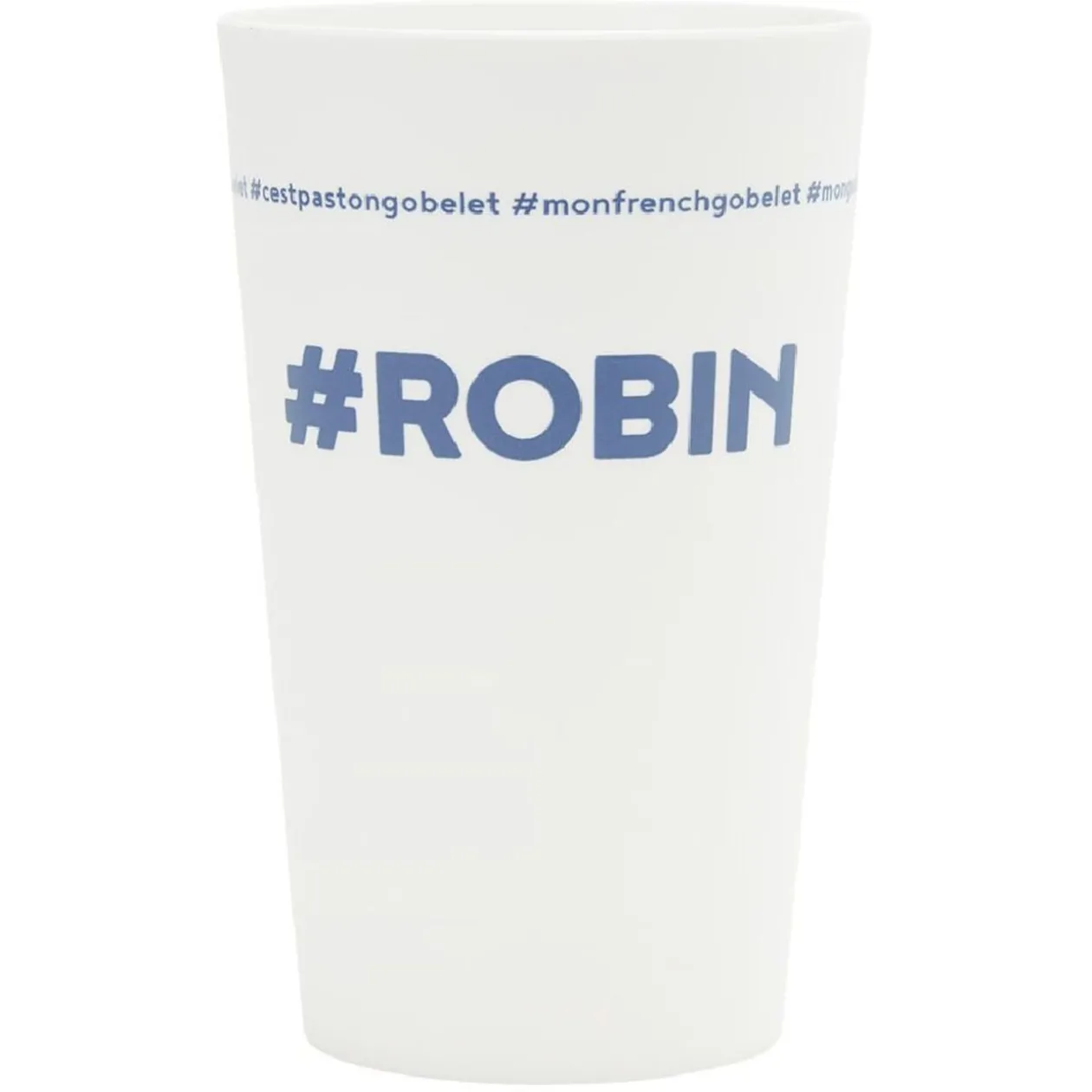 Gobelet réutilisable en plastique blanc avec inscription bleue #ROBIN.