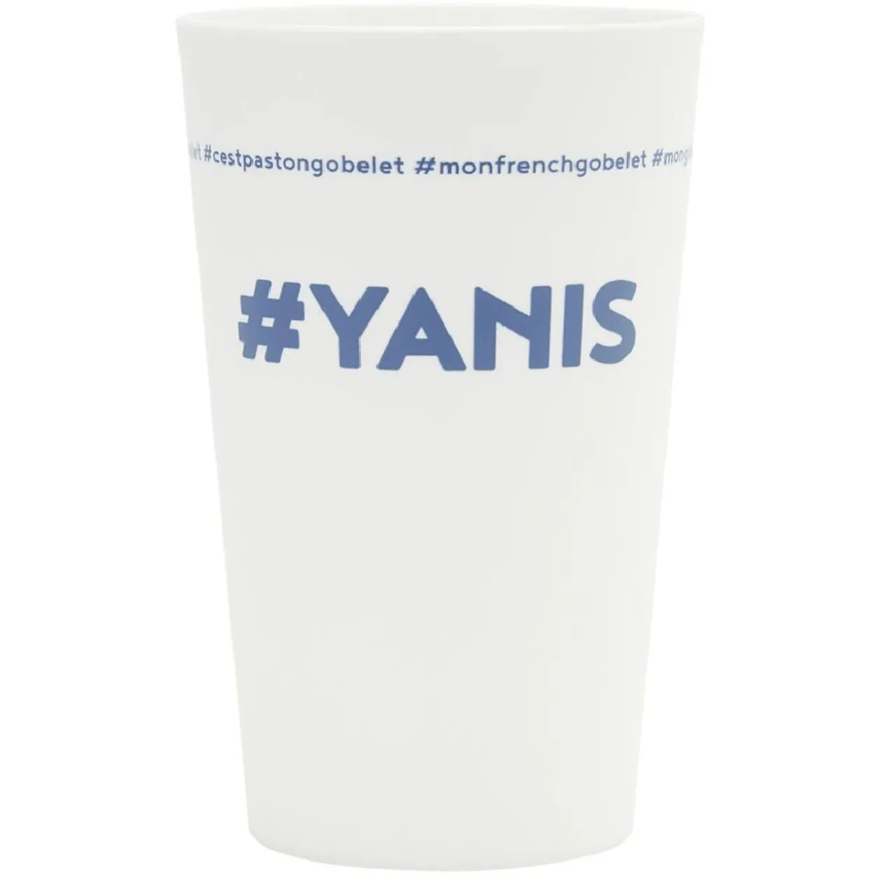 Gobelet réutilisable en plastique blanc avec inscription bleue #YANIS.