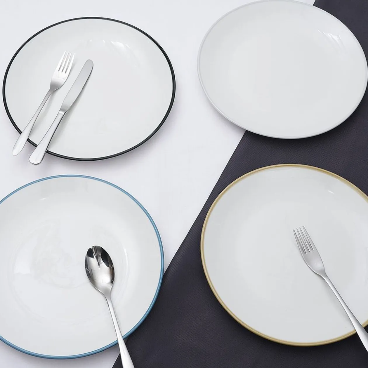 Ce service composé de 4 assiettes blanches avec liseré coloré sur le bord, noir, bleu, jaune et gris, sera du plus bel effet en toutes occasions.