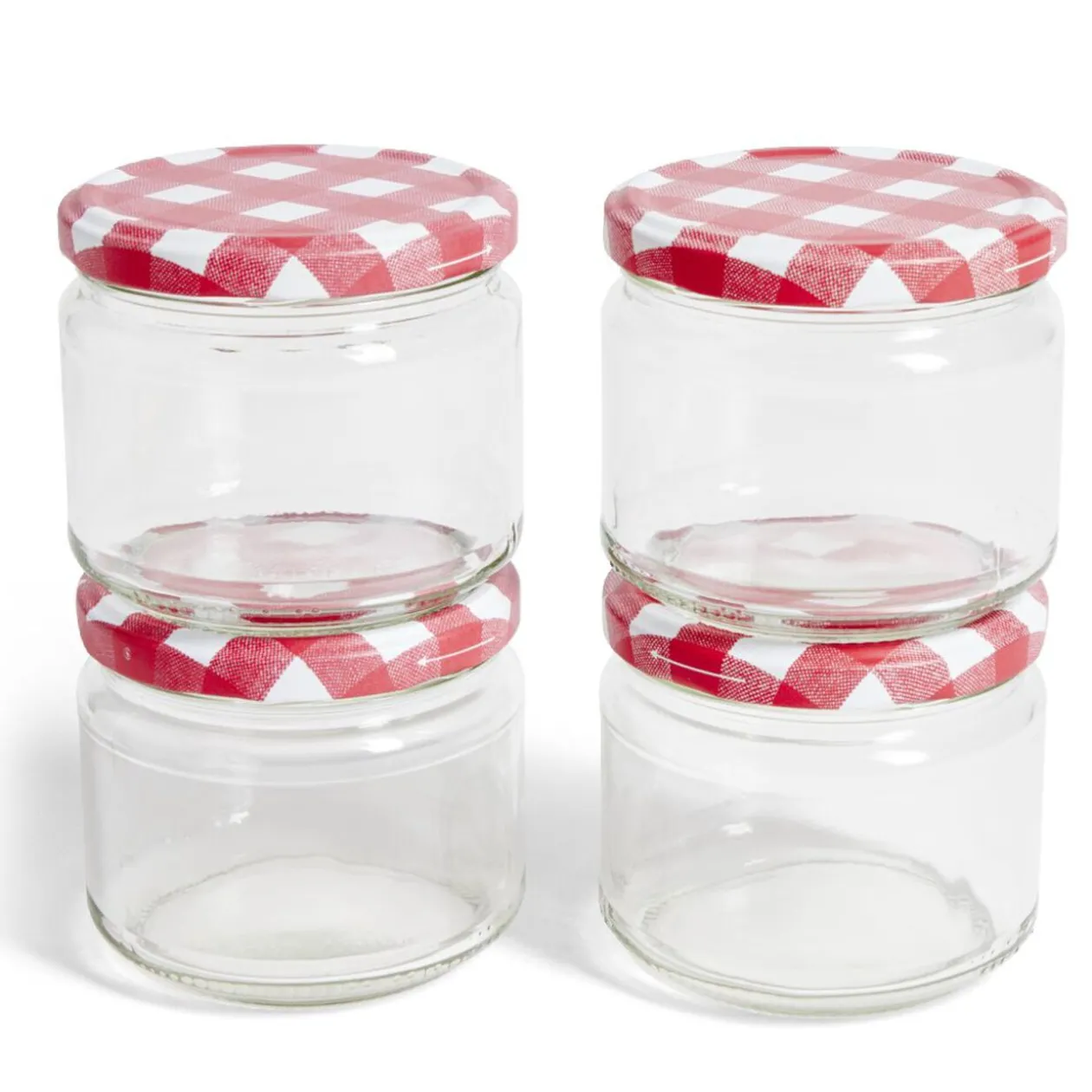 Lot de 4 pots à confiture, fabriqués en acier et en verre, parfait pour conserver et présenter vos confitures maison comme avant grâce à leurs couvercle à carreaux rouge et blanc.