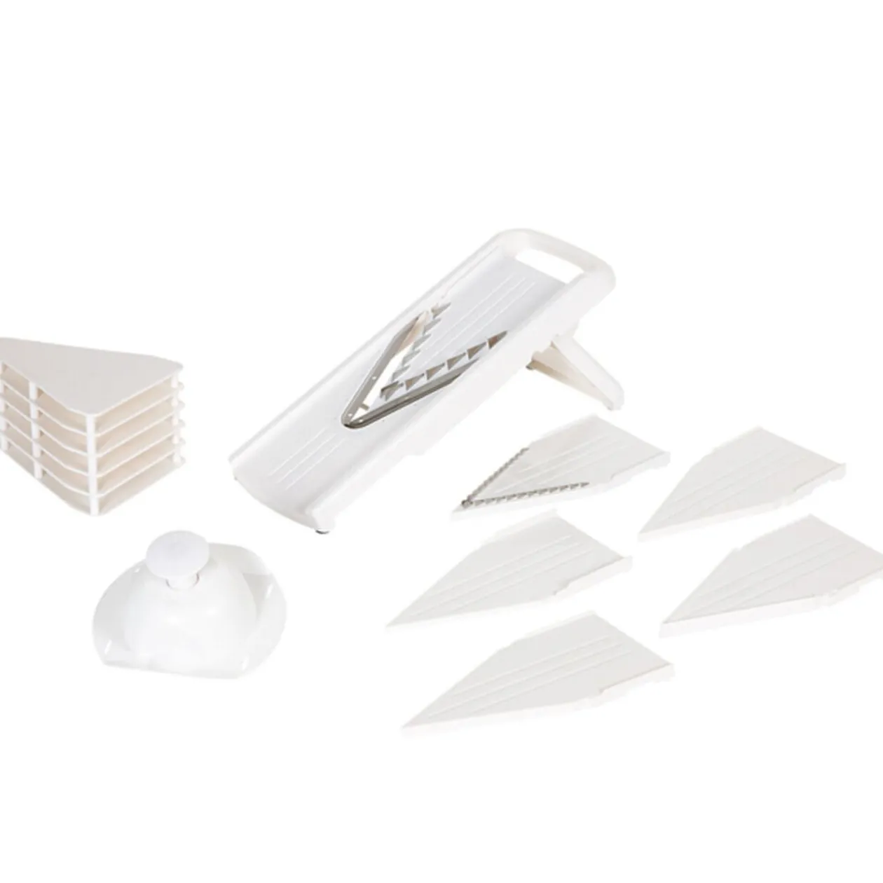 Mandoline 8 pièces, dim. 38,5×13 cm, plastique, contient 5 accessoires de découpe, 1 lame inox, 1 poussoir, 1 rangement. La mandoline coupe, tranche, émince et râpe tous les aliments.
