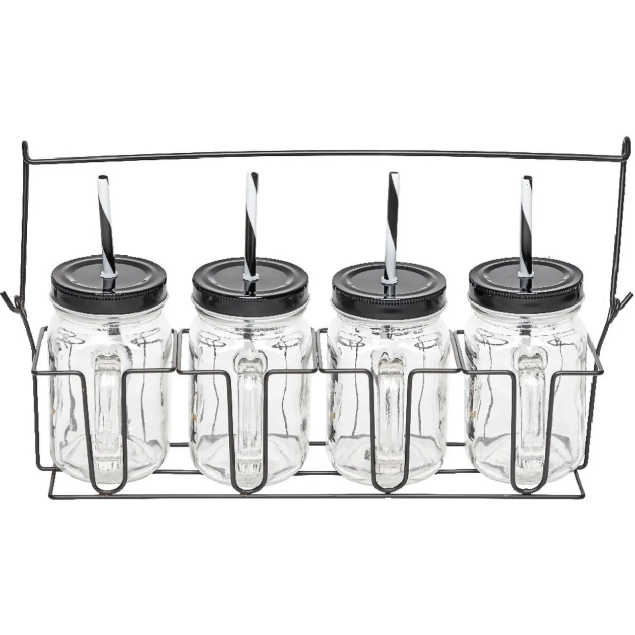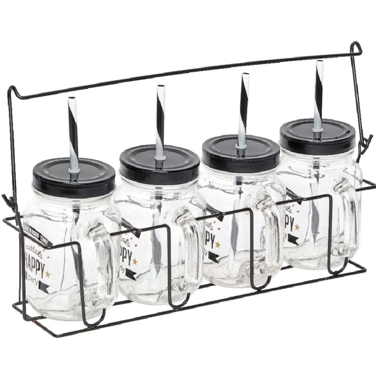 Passez un bon moment entre amis avec ces bocaux à anse. Le design joyeux de ce mason jar avec l’inscription « Happy », son couvercle et sa paille noire et blanche à rayures mettra en valeur toutes vos boissons. Facilitez votre service avec le support qui se transporte partout. Servez de bons chocolats chauds pour l’hiver ou de bons cocktails pour un après-midi ensoleillé.