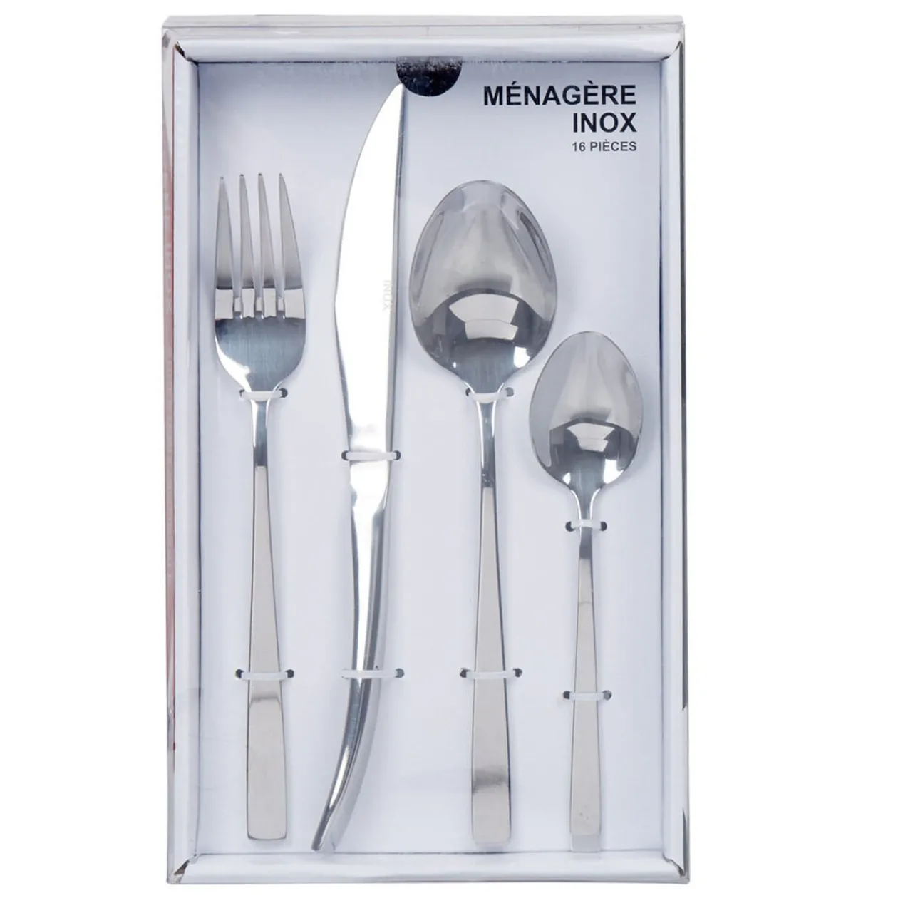 Comprend 4 fourchettes, 4 couteaux, 4 cuillères à soupe et 4 cuillères à café.