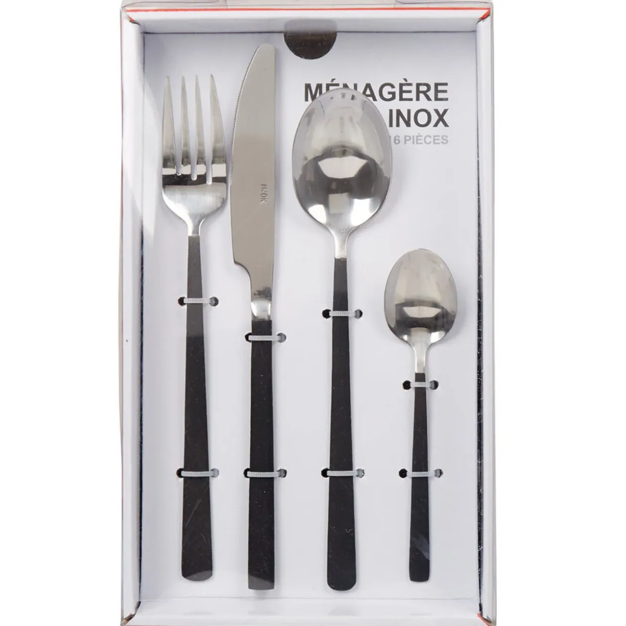 Ménagère 16 pièces moderne, inox et manche avec couverture en silicone noir.