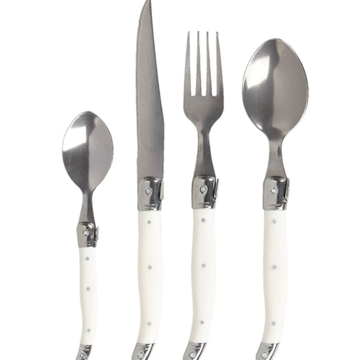 Ménagère 24 pièces blanc comprenant 6 fourchettes, 6 cuillères à soupe, 6 couteaux et 6 cuillères à café, inox, manche plastique.