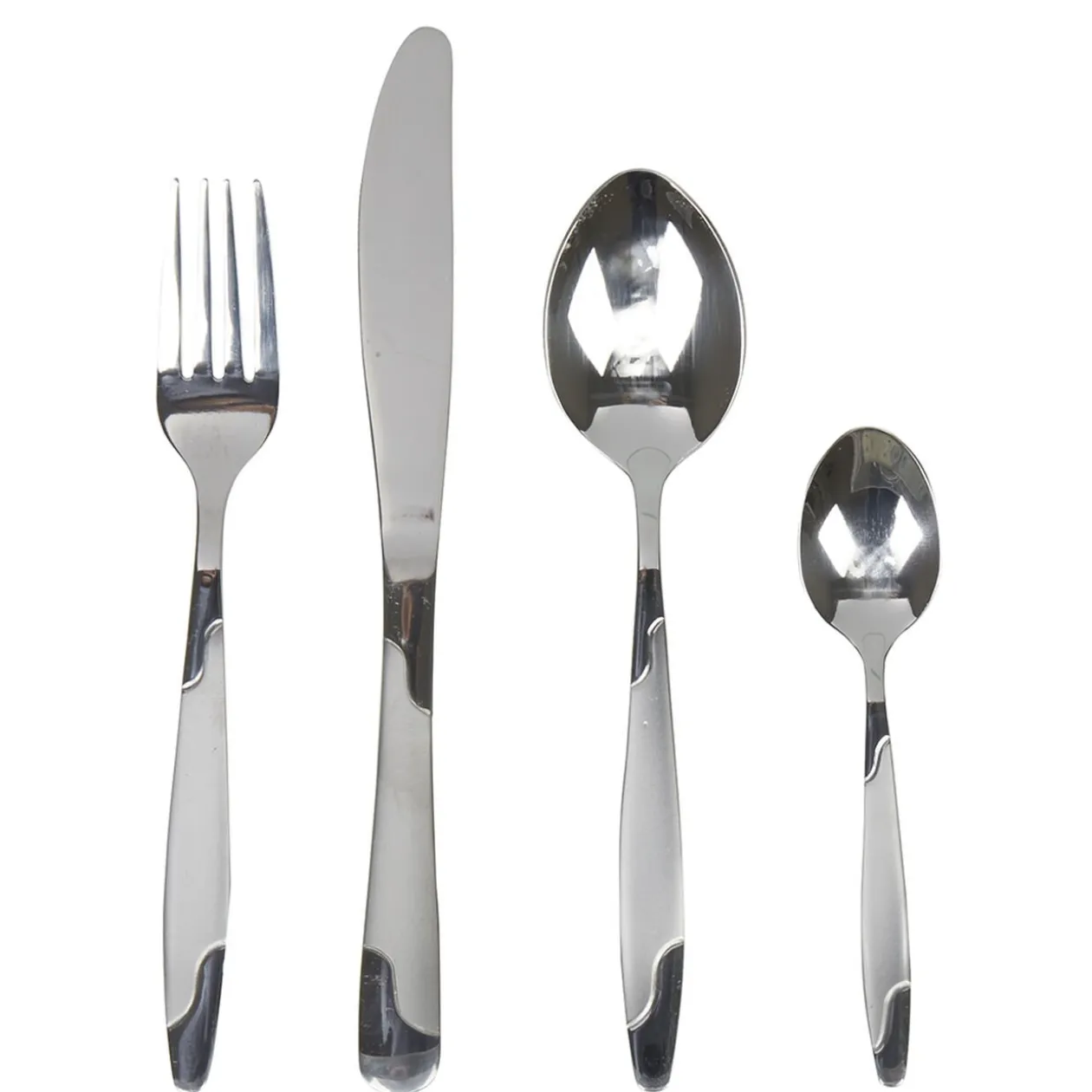 La simplicité a tout bon avec cette ménagère de 24 pièces avec 6 fourchettes, 6 couteaux ronds, 6 grandes cuillères et 6 petites cuillères couleur argent.