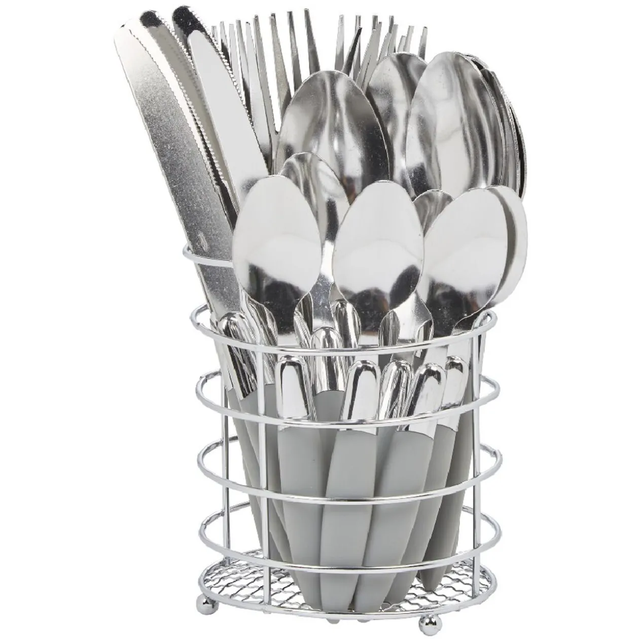 Ménagère 24 pièces de couleur grise avec son panier.