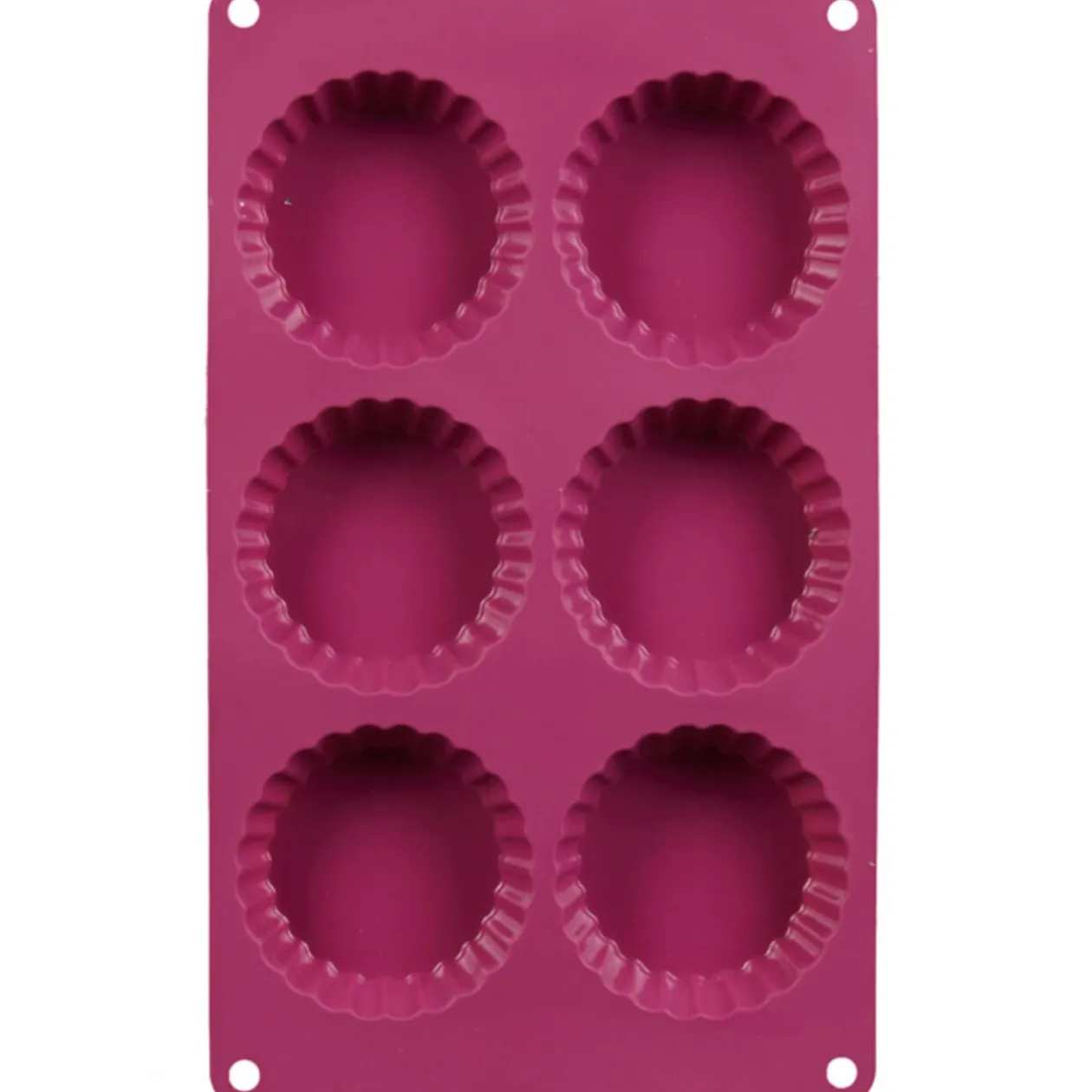 Moule silicone pour 6 tartelettes dim. Ø7,5×2,5 cm, plaque dim. 29×17 cm. Cuisson four et Micro-ondes, passe au lave-vaisselle, + 220°C, – 20°C. Diff. coloris, disponibilité selon arrivage.