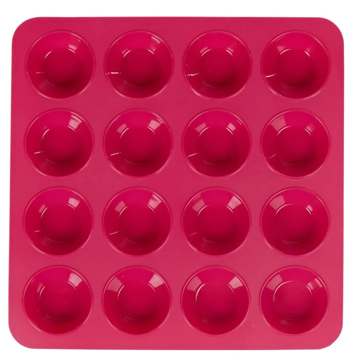 Moule carré en silicone de couleur rose avec empreintes pour la cuisson de 16 petits fours.
